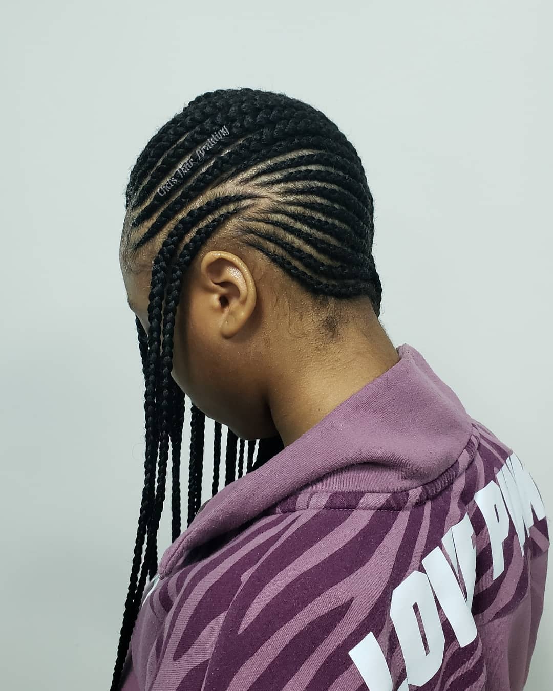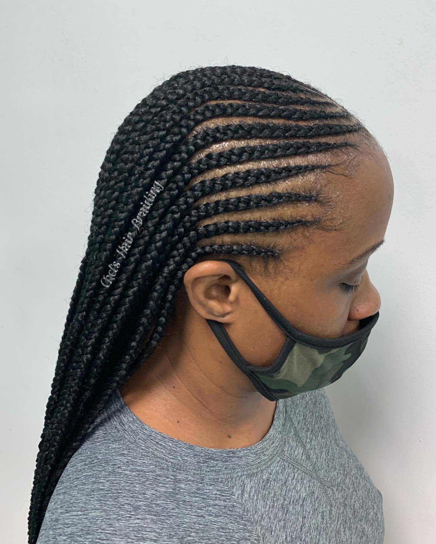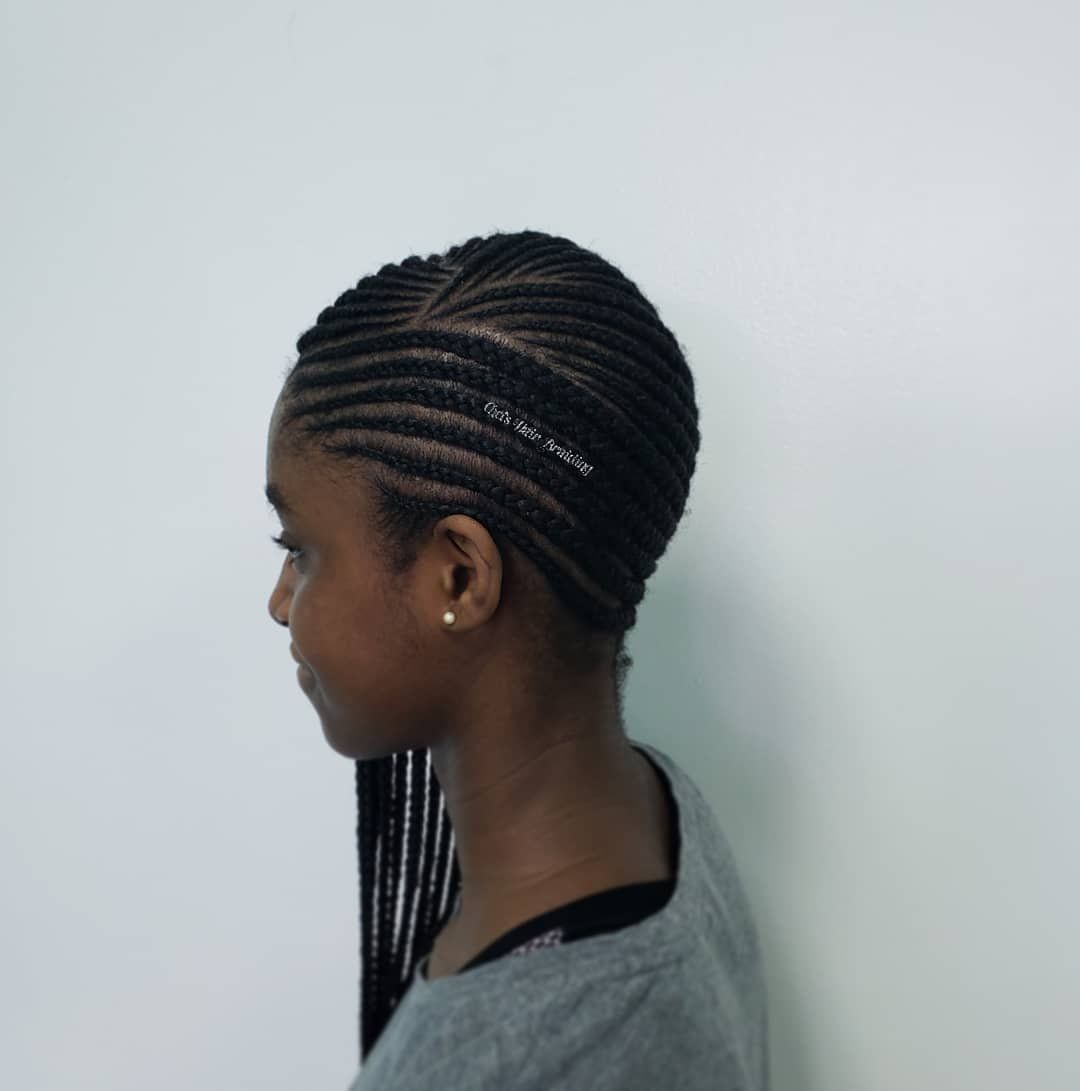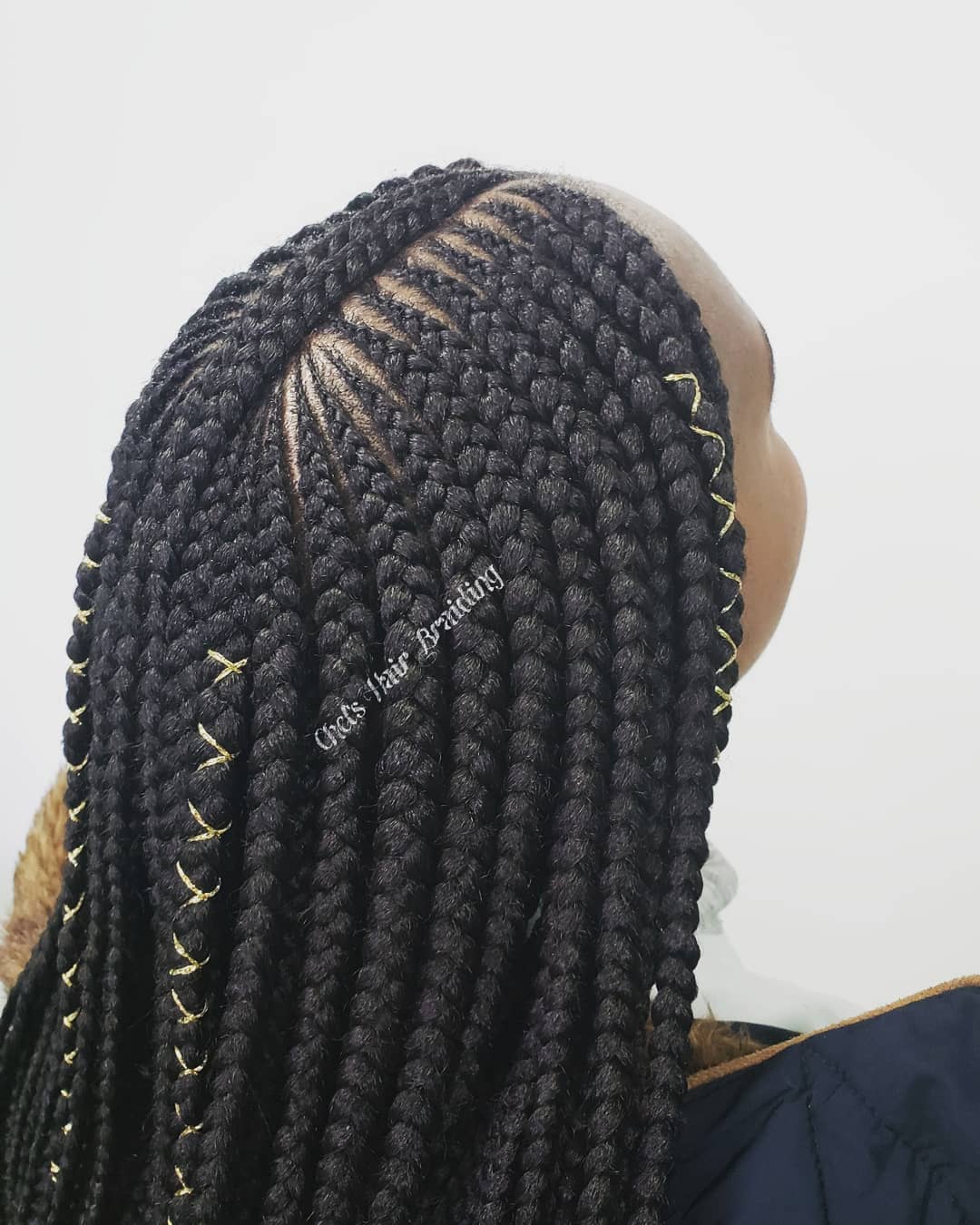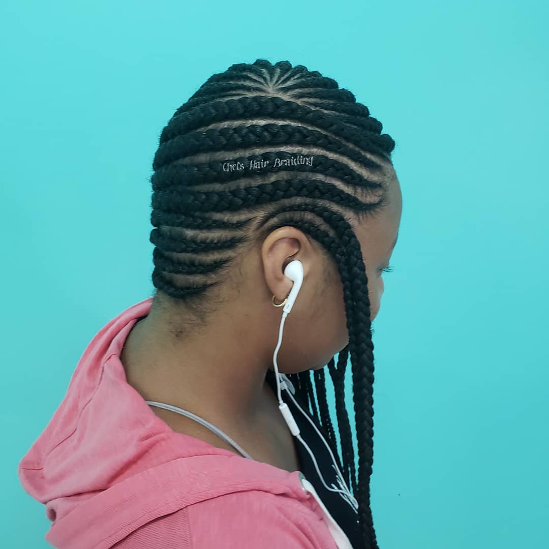 Evolved from Ghana braid and feed-in cornrows. It is fire and elegant. Stitch braids are a good protective style. Will aid length retention due to less hair manipulation. Great fit for all ages. The magnificence of the stitch braids is in the final look a neat and unique look. One can opt to add decorations (beads or colorful strain to some braids). Long lasting. You can have a bun, ponytail, half up and half down, etc.