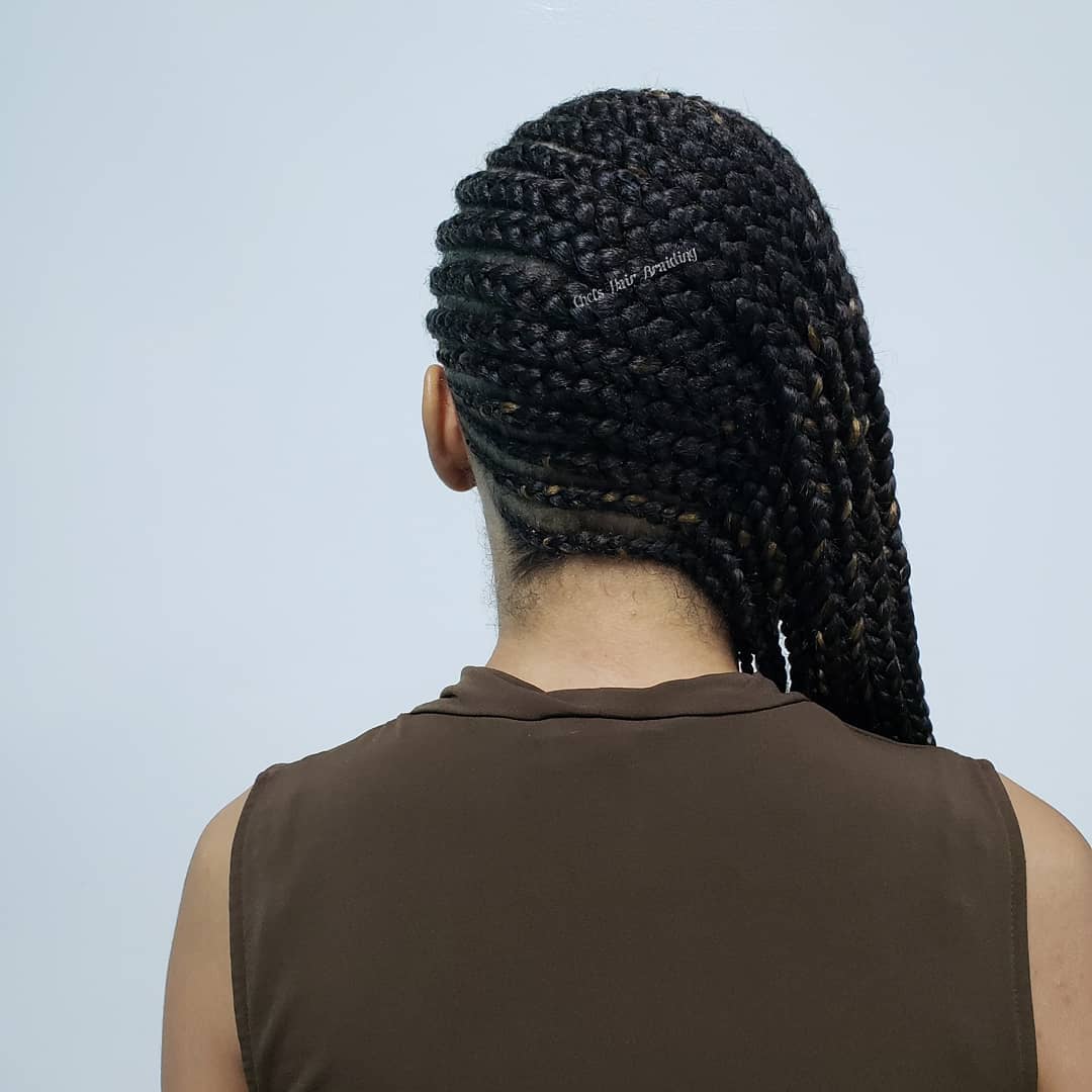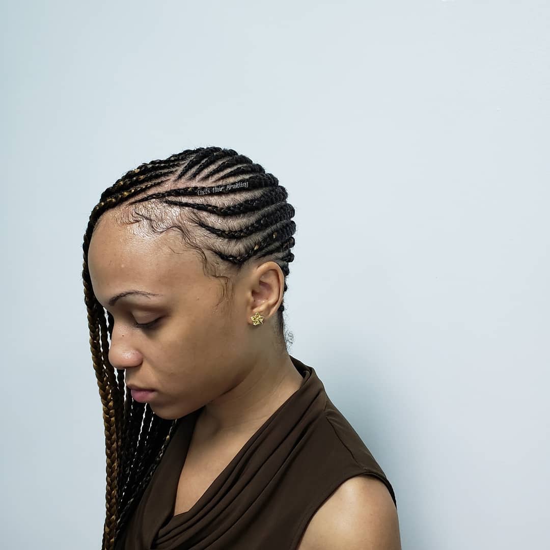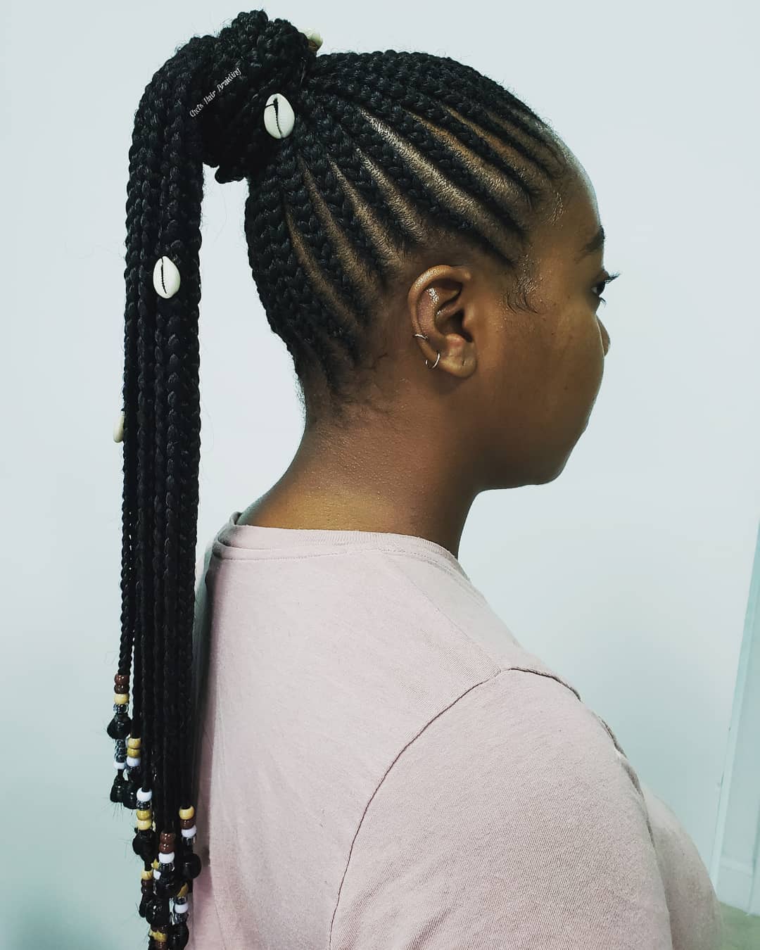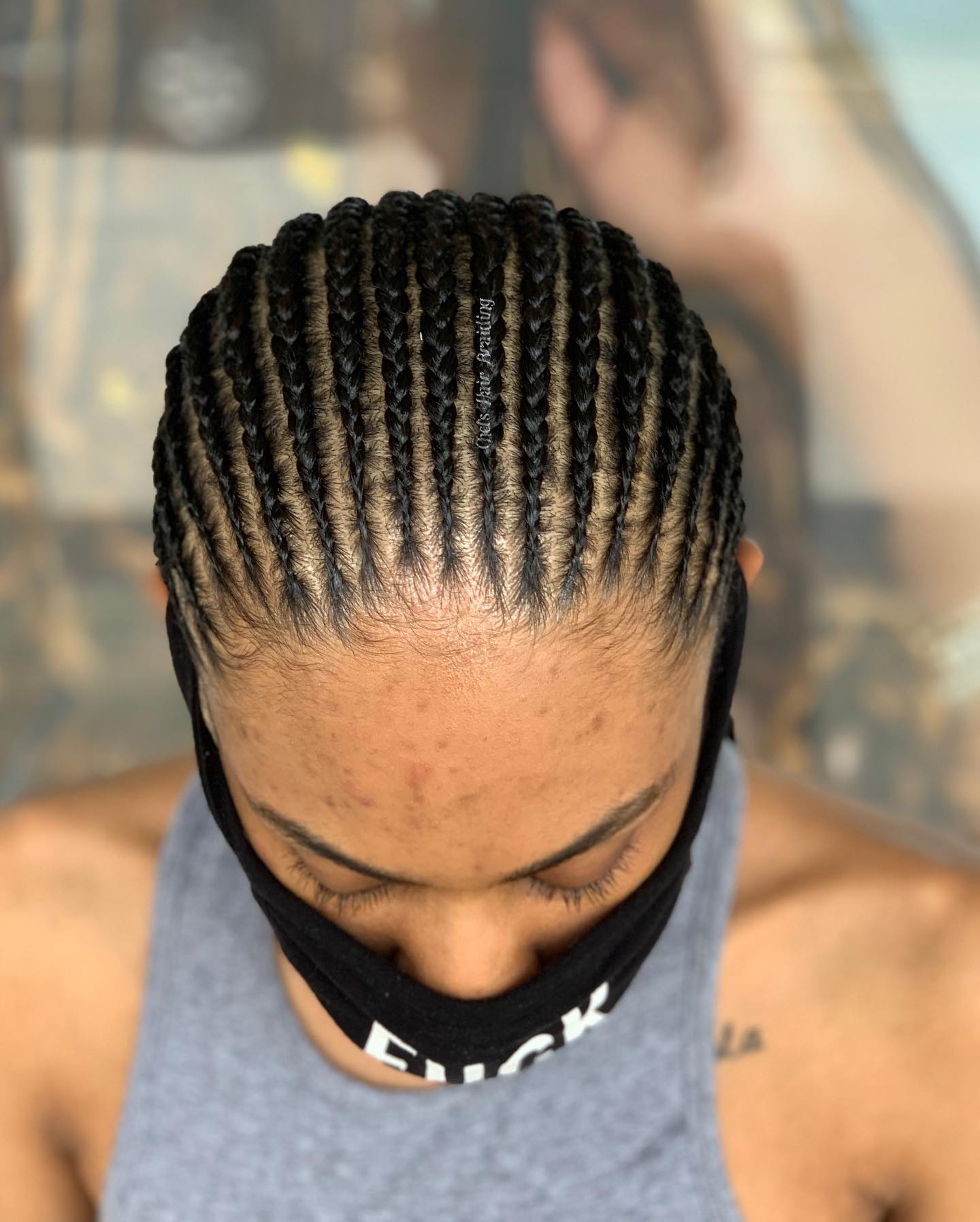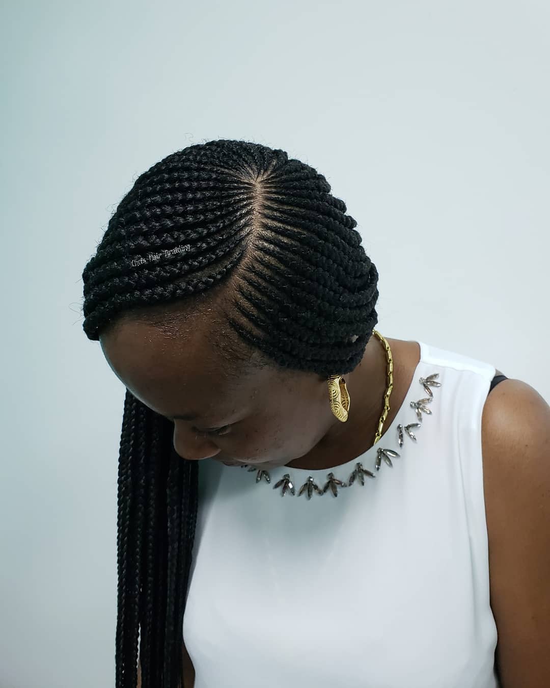 Evolved from Ghana braid and feed-in cornrows. It is fire and elegant. Stitch braids are a good protective style. Will aid length retention due to less hair manipulation. Great fit for all ages. The magnificence of the stitch braids is in the final look a neat and unique look. One can opt to add decorations (beads or colorful strain to some braids). Long lasting. You can have a bun, ponytail, half up and half down, etc.