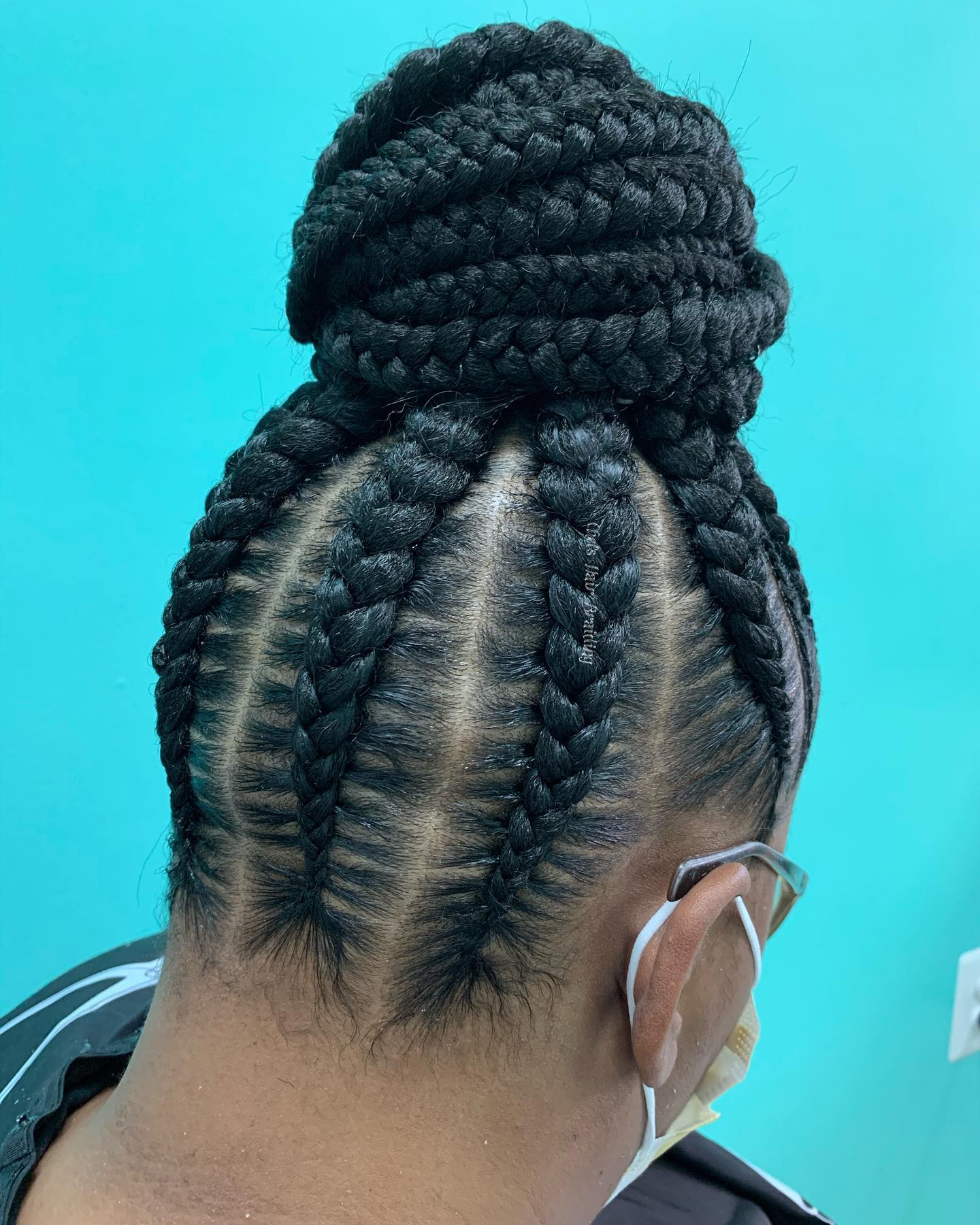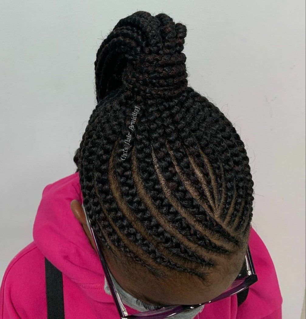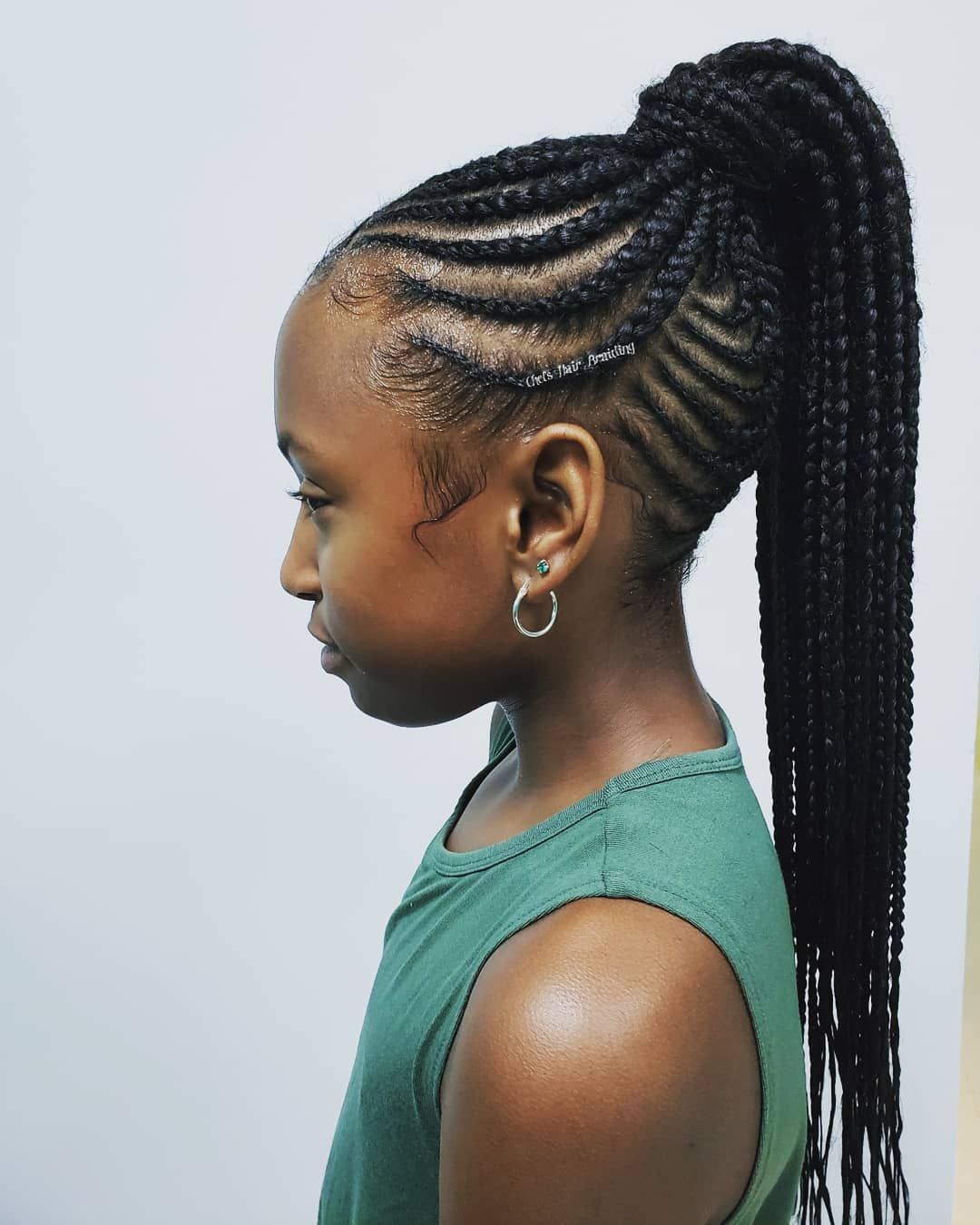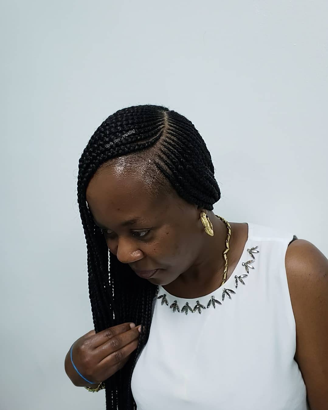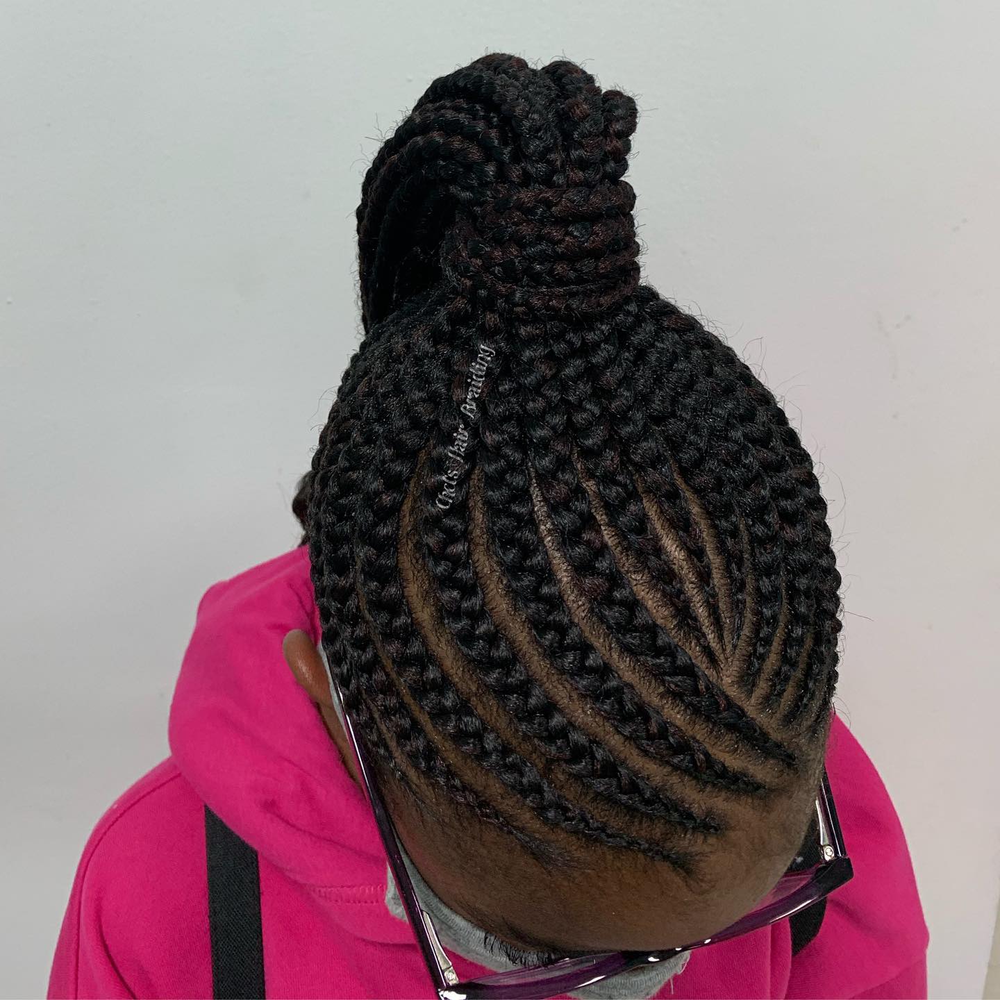 Evolved from Ghana braid and feed-in cornrows. It is fire and elegant. Stitch braids are a good protective style. Will aid length retention due to less hair manipulation. Great fit for all ages. The magnificence of the stitch braids is in the final look a neat and unique look. One can opt to add decorations (beads or colorful strain to some braids). Long lasting. You can have a bun, ponytail, half up and half down, etc.