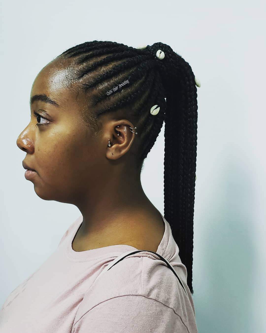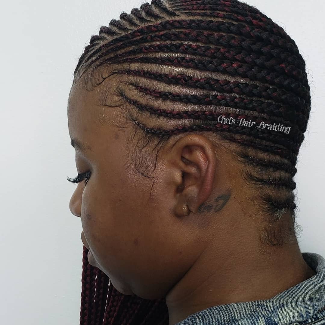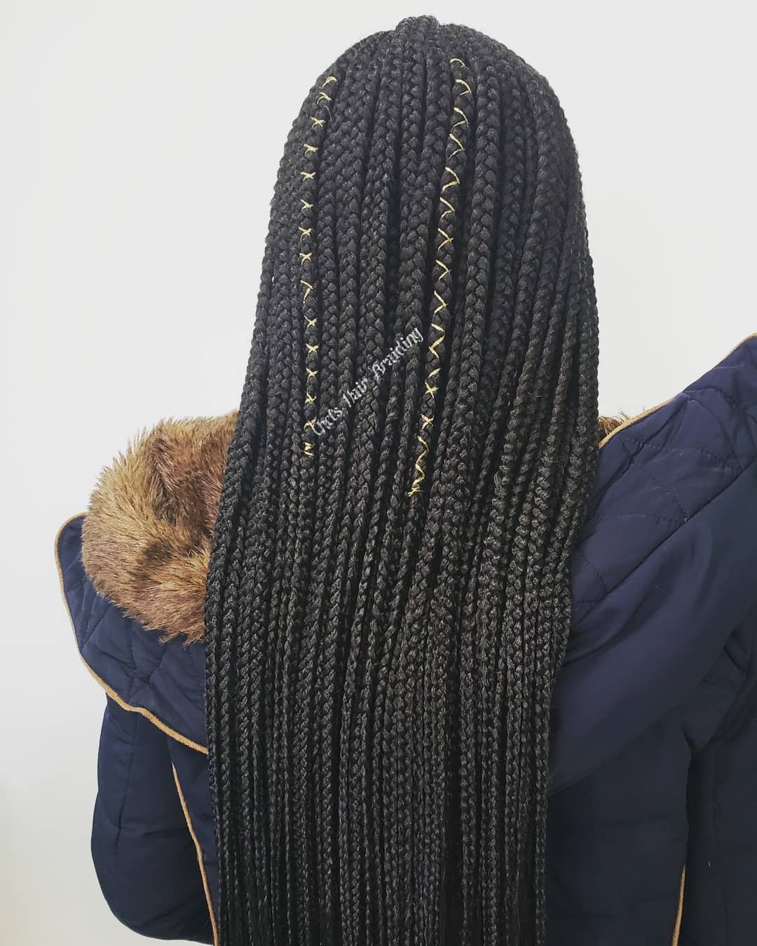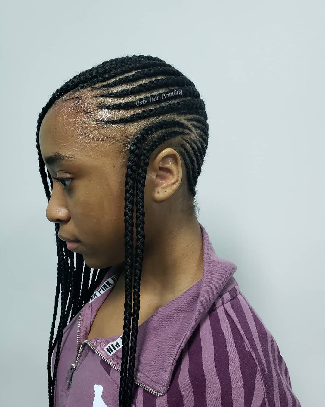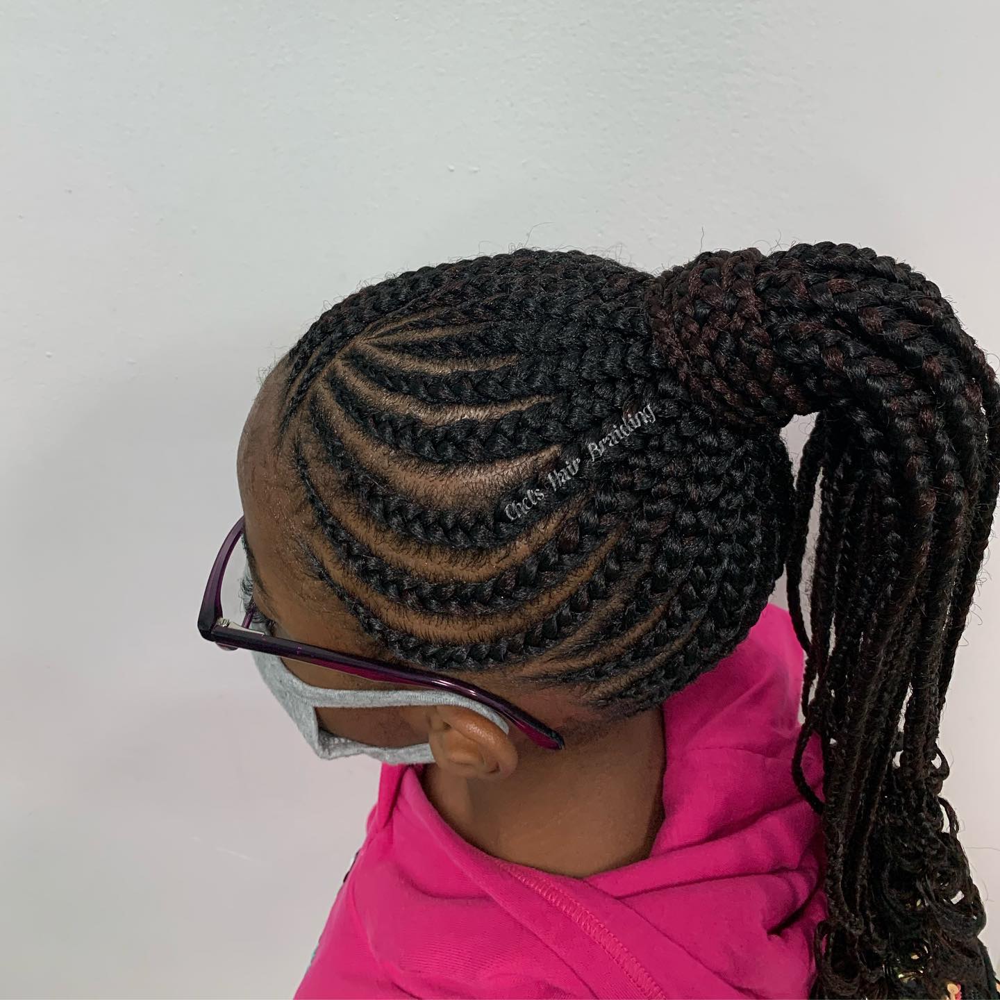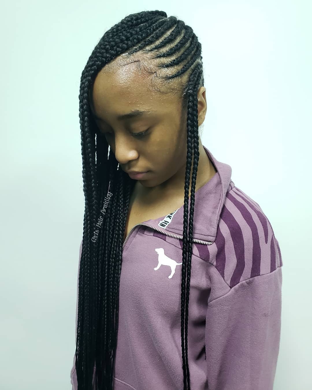 Evolved from Ghana braid and feed-in cornrows. It is fire and elegant. Stitch braids are a good protective style. Will aid length retention due to less hair manipulation. Great fit for all ages. The magnificence of the stitch braids is in the final look a neat and unique look. One can opt to add decorations (beads or colorful strain to some braids). Long lasting. You can have a bun, ponytail, half up and half down, etc.