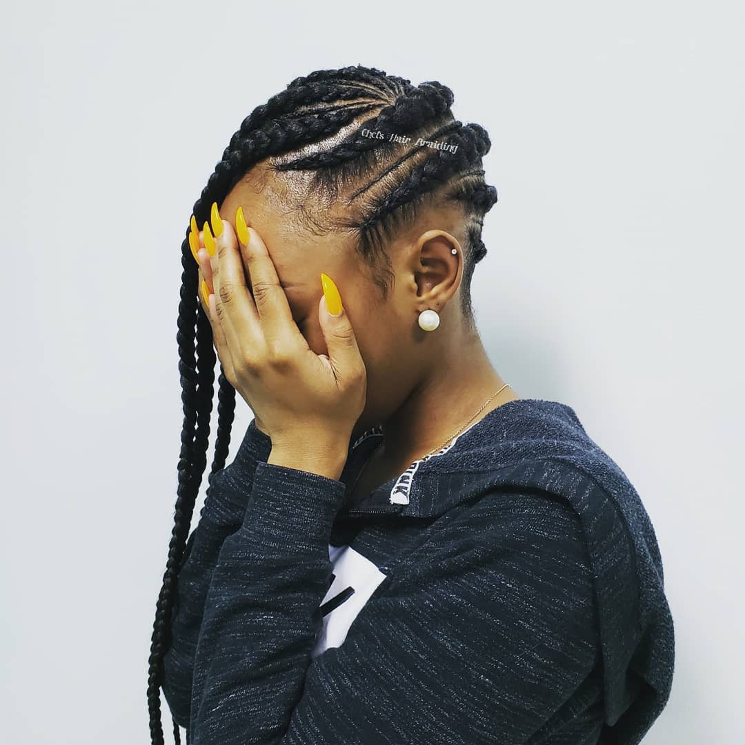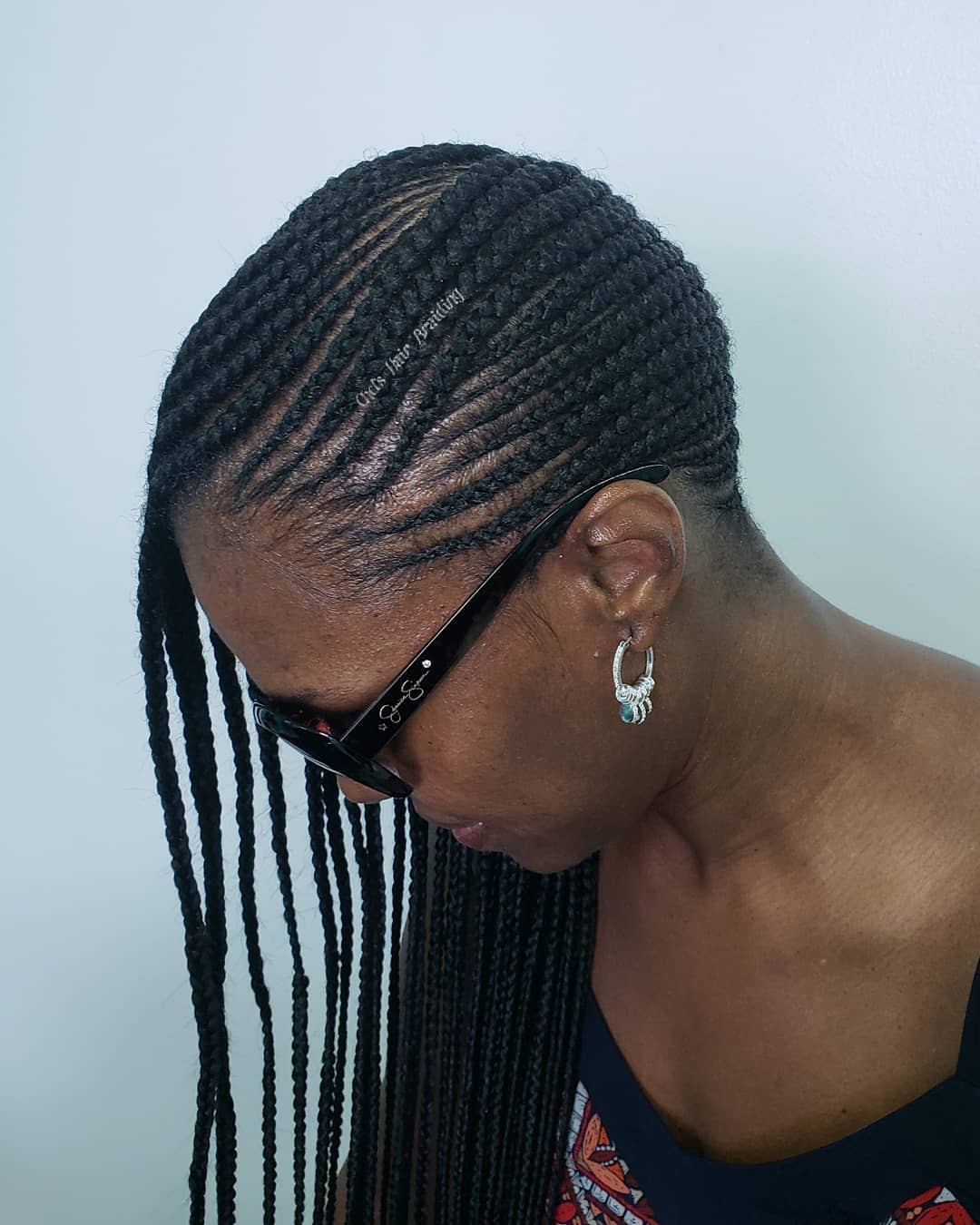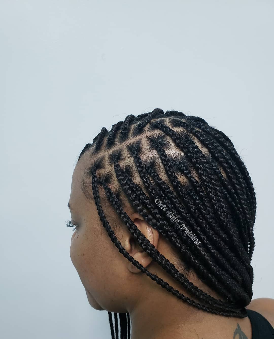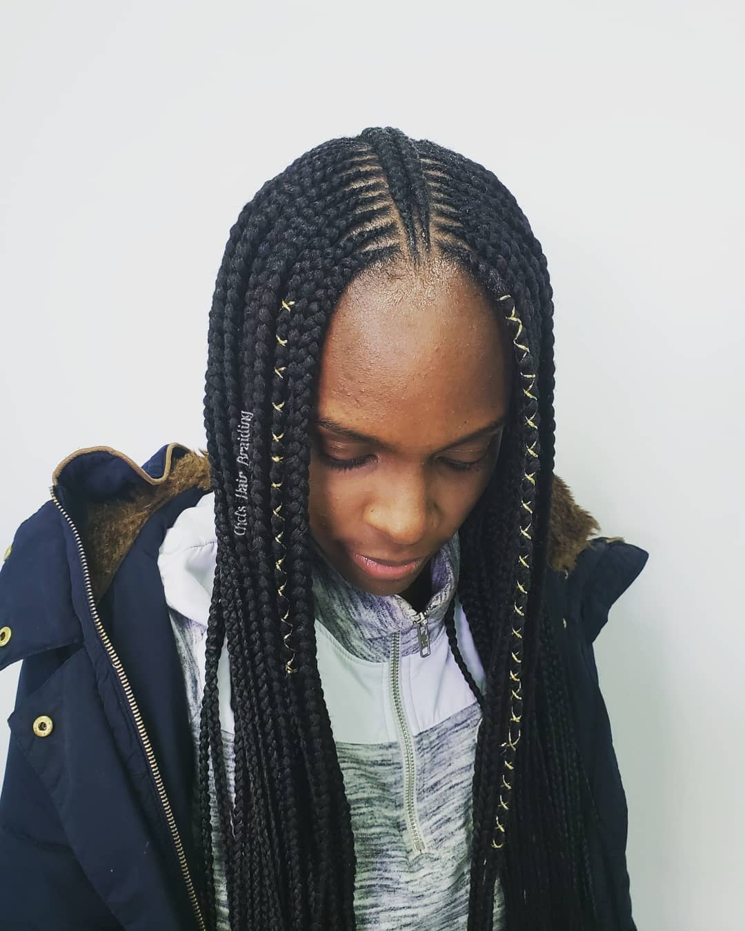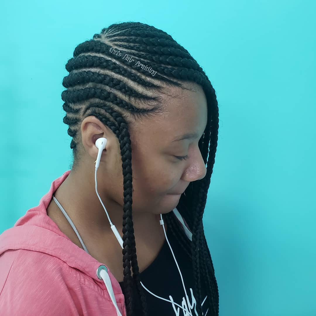 Evolved from Ghana braid and feed-in cornrows. It is fire and elegant. Stitch braids are a good protective style. Will aid length retention due to less hair manipulation. Great fit for all ages. The magnificence of the stitch braids is in the final look a neat and unique look. One can opt to add decorations (beads or colorful strain to some braids). Long lasting. You can have a bun, ponytail, half up and half down, etc.