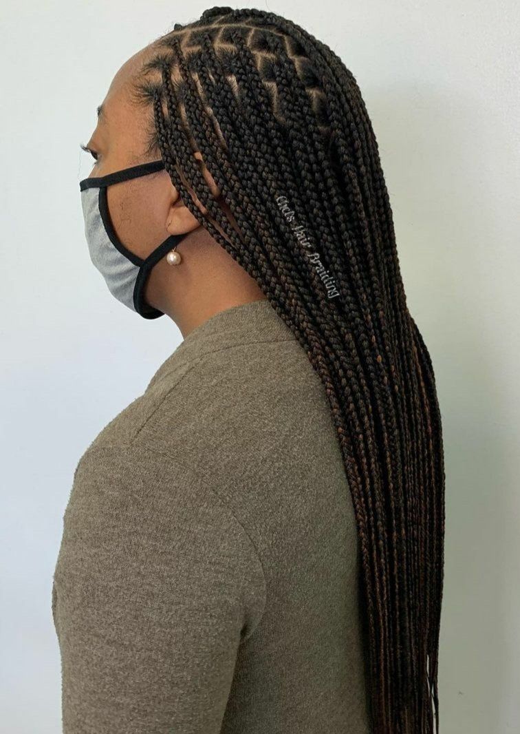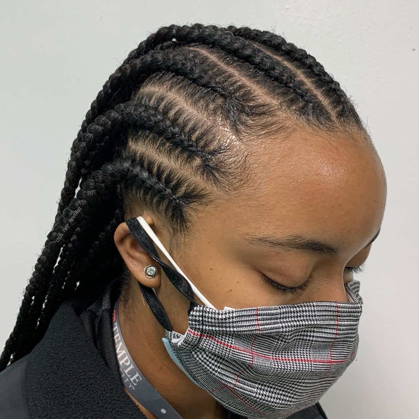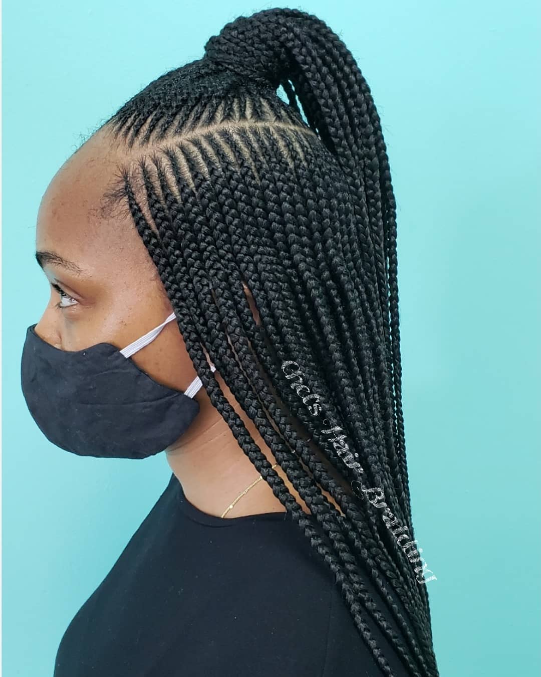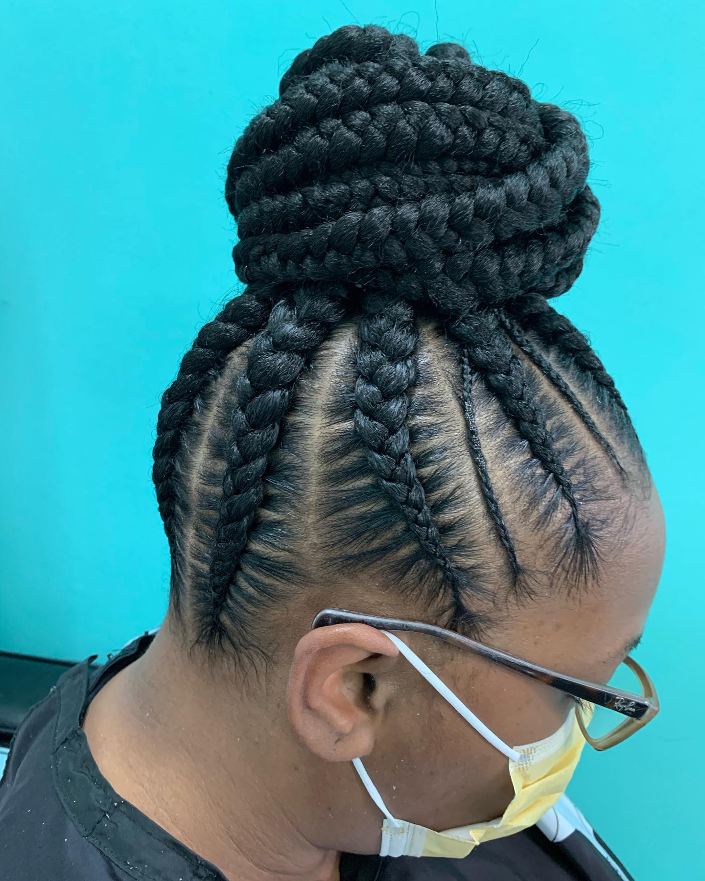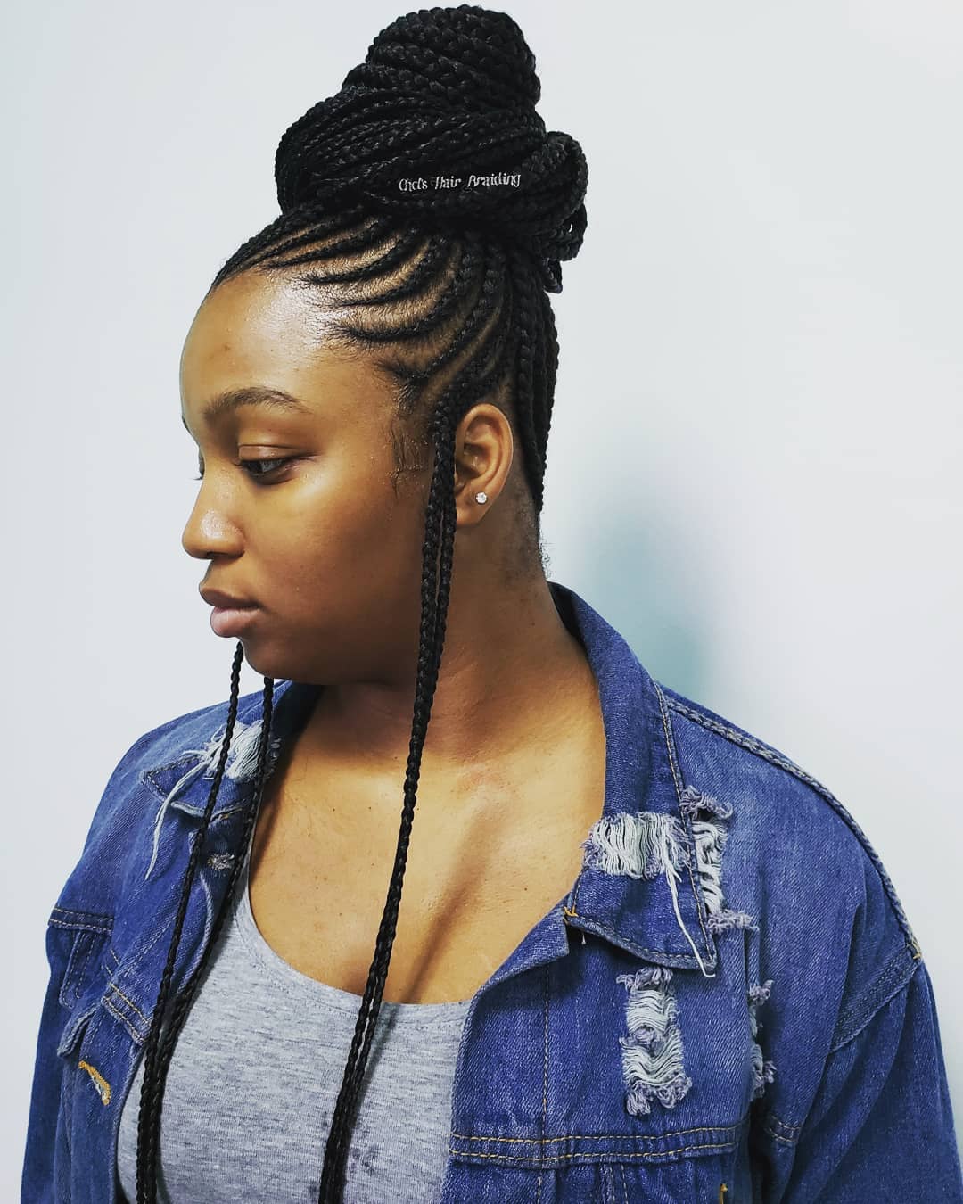 Evolved from Ghana braid and feed-in cornrows. It is fire and elegant. Stitch braids are a good protective style. Will aid length retention due to less hair manipulation. Great fit for all ages. The magnificence of the stitch braids is in the final look a neat and unique look. One can opt to add decorations (beads or colorful strain to some braids). Long lasting. You can have a bun, ponytail, half up and half down, etc.