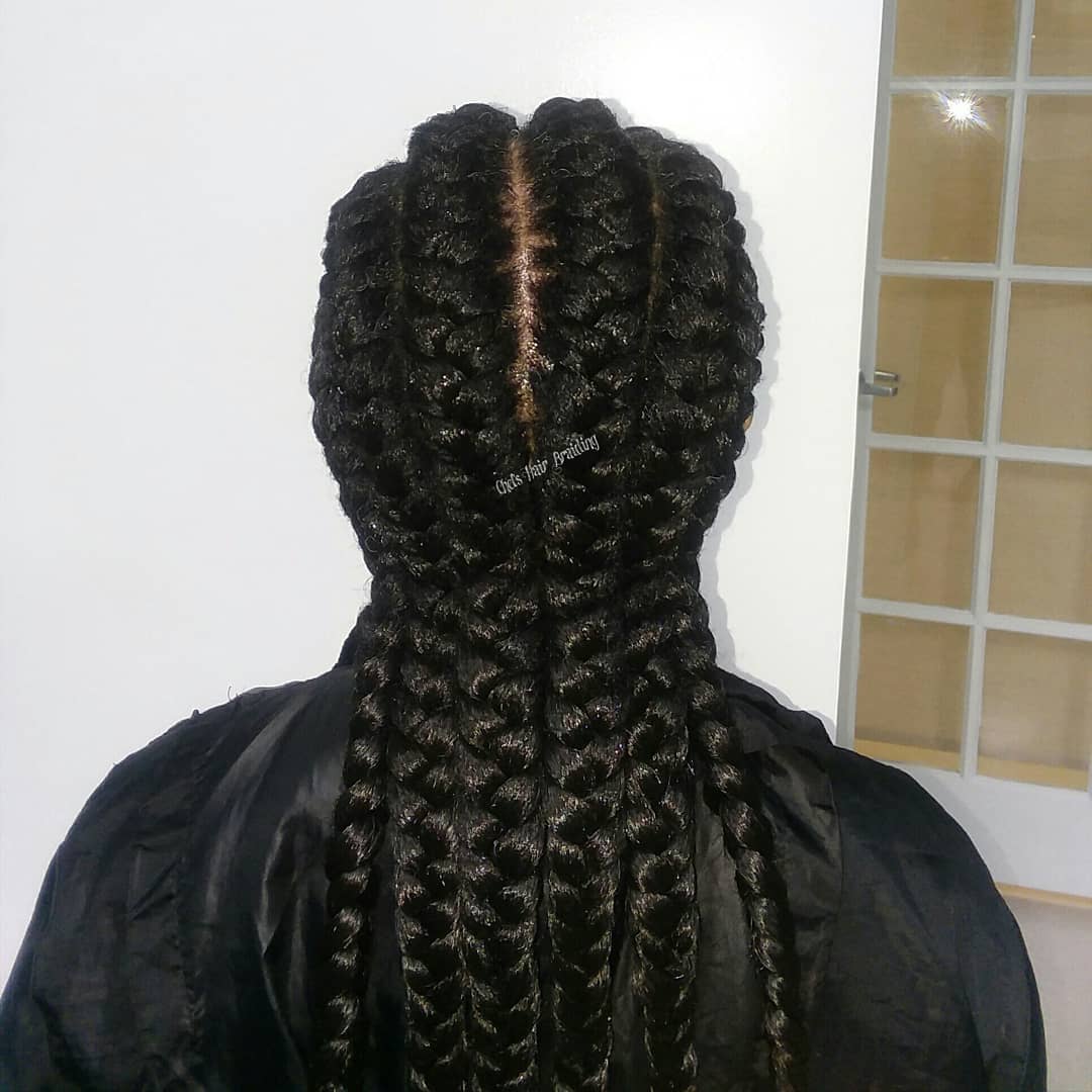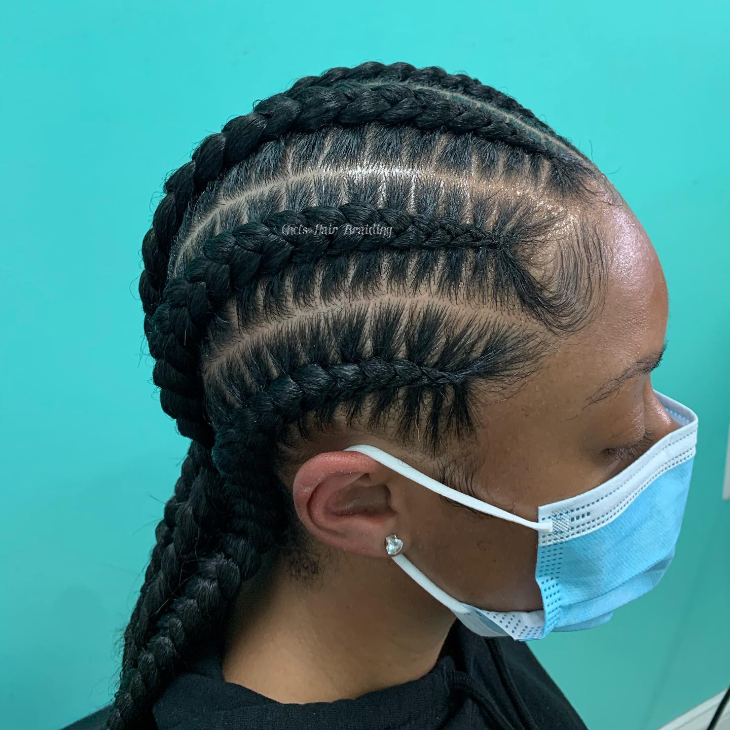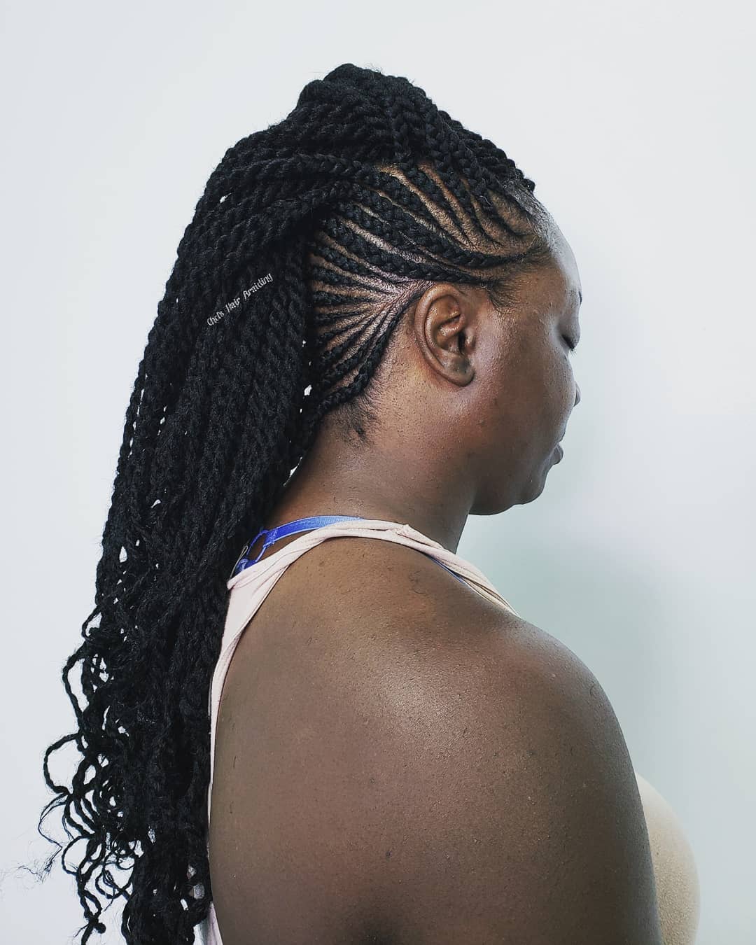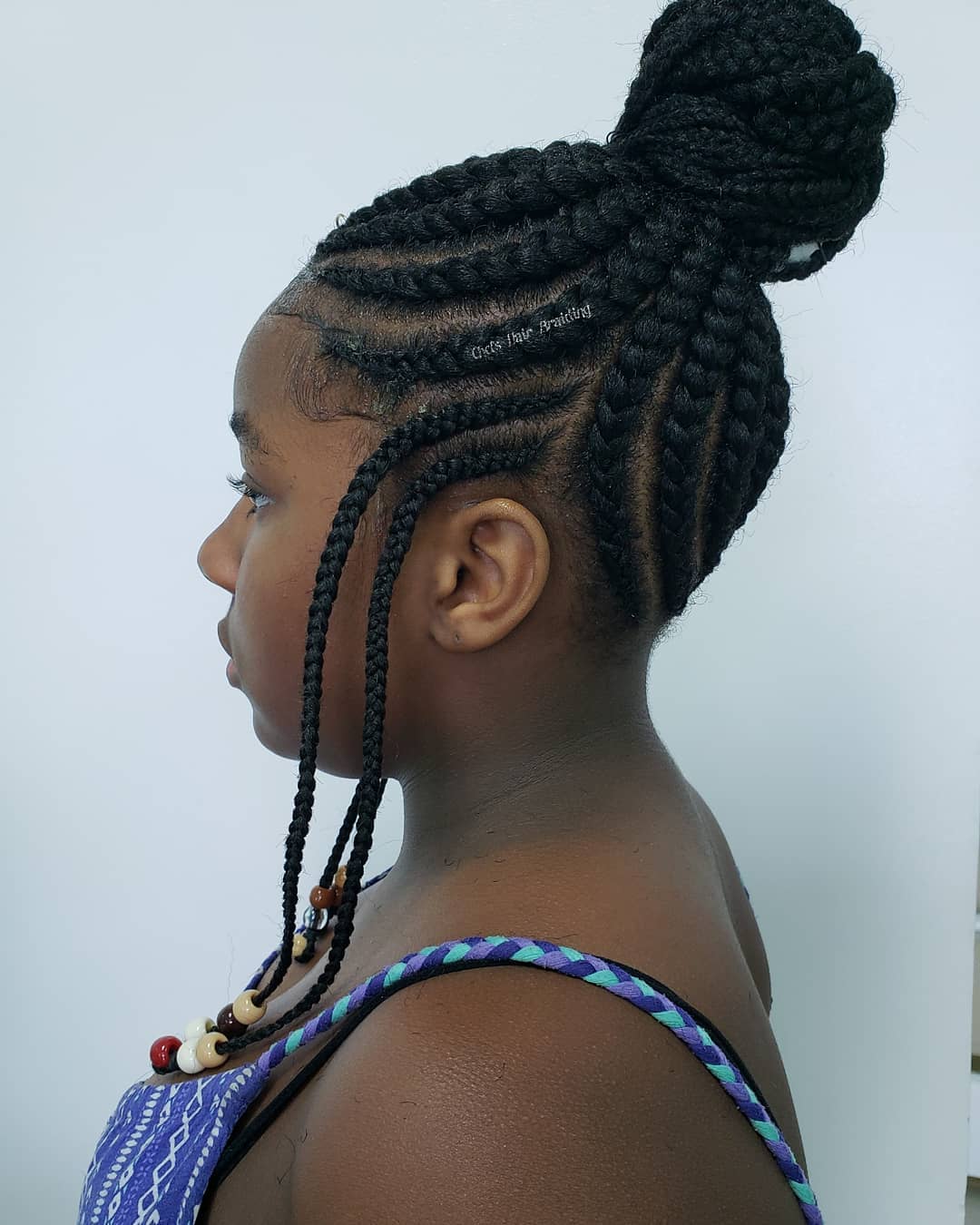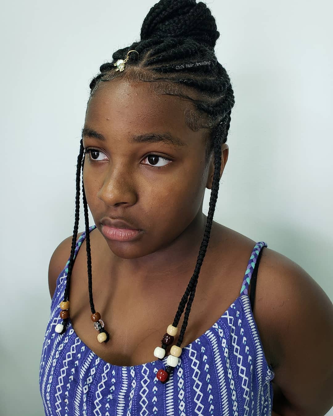 Evolved from Ghana braid and feed-in cornrows. It is fire and elegant. Stitch braids are a good protective style. Will aid length retention due to less hair manipulation. Great fit for all ages. The magnificence of the stitch braids is in the final look a neat and unique look. One can opt to add decorations (beads or colorful strain to some braids). Long lasting. You can have a bun, ponytail, half up and half down, etc.