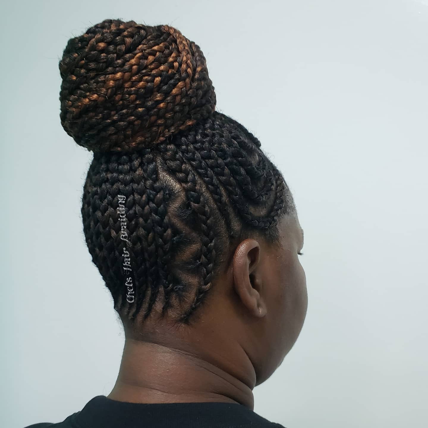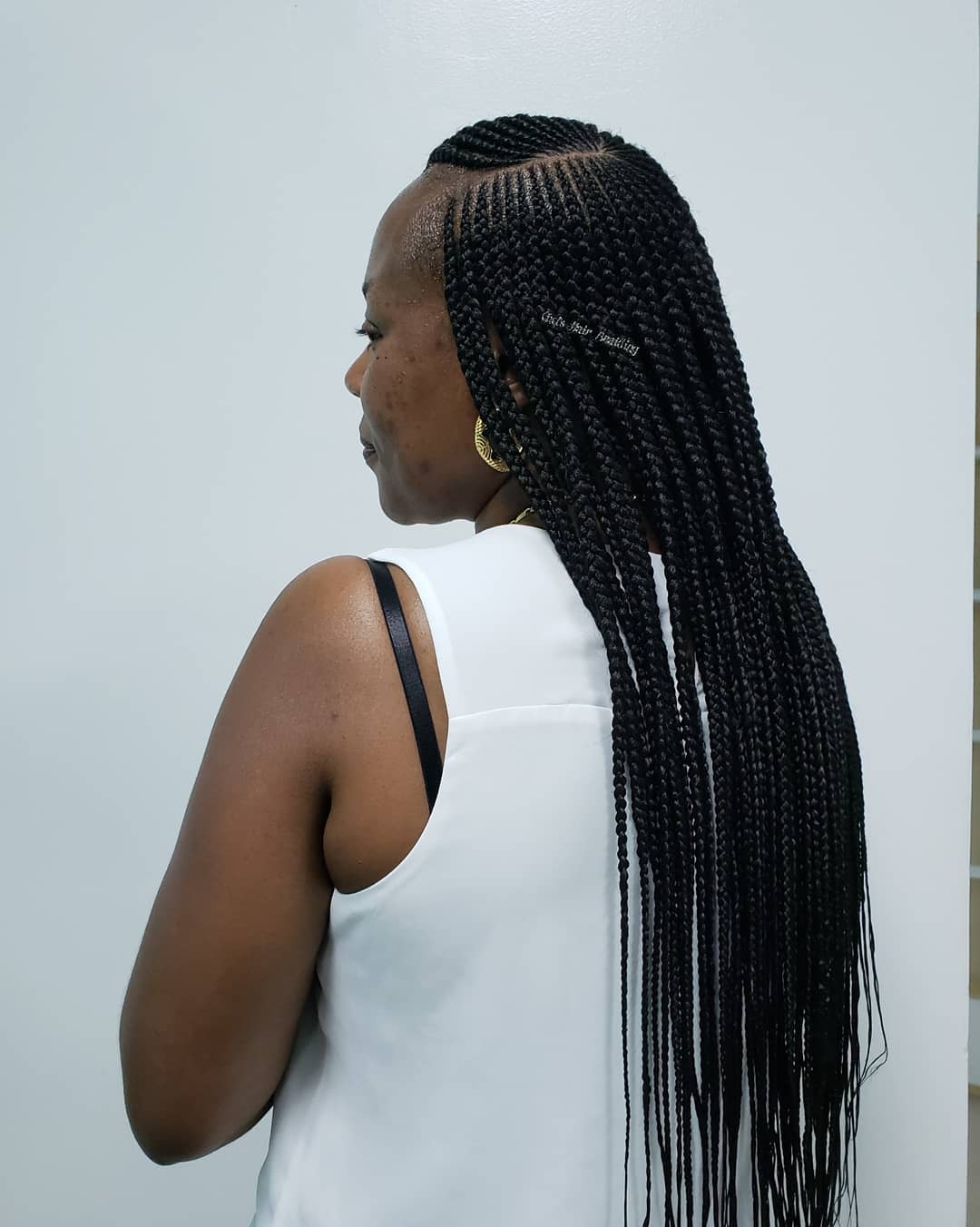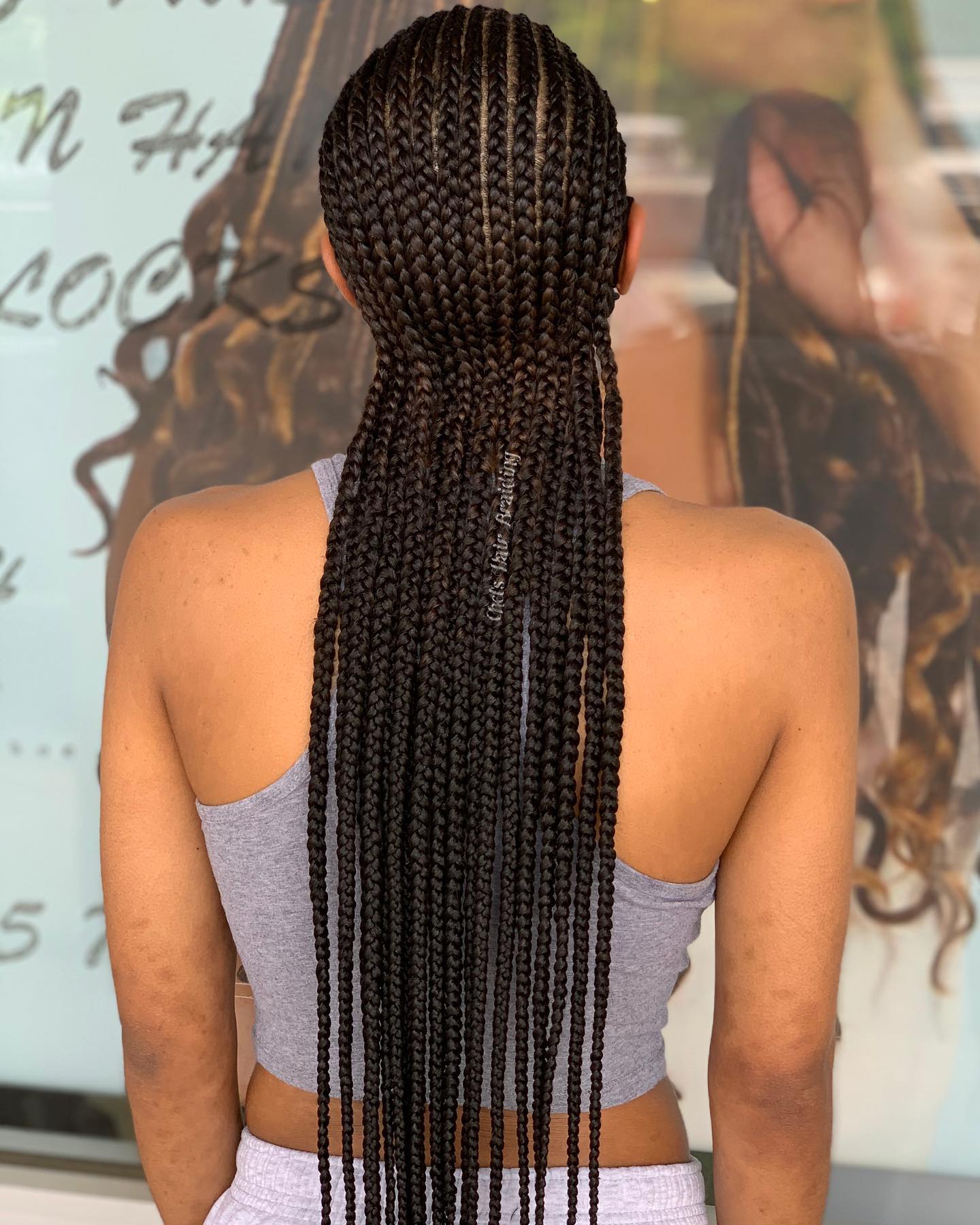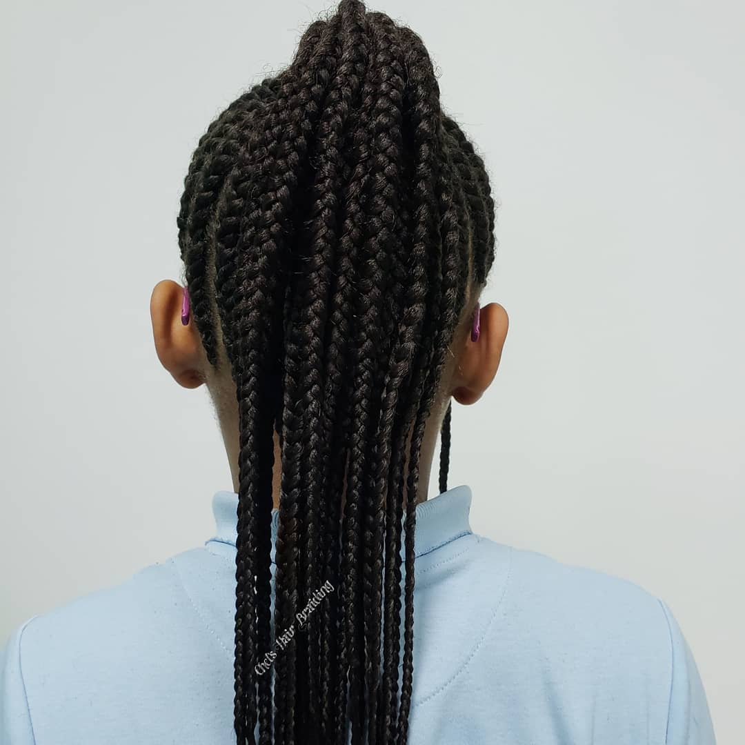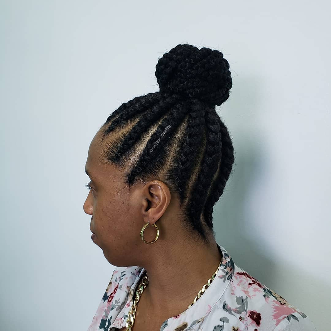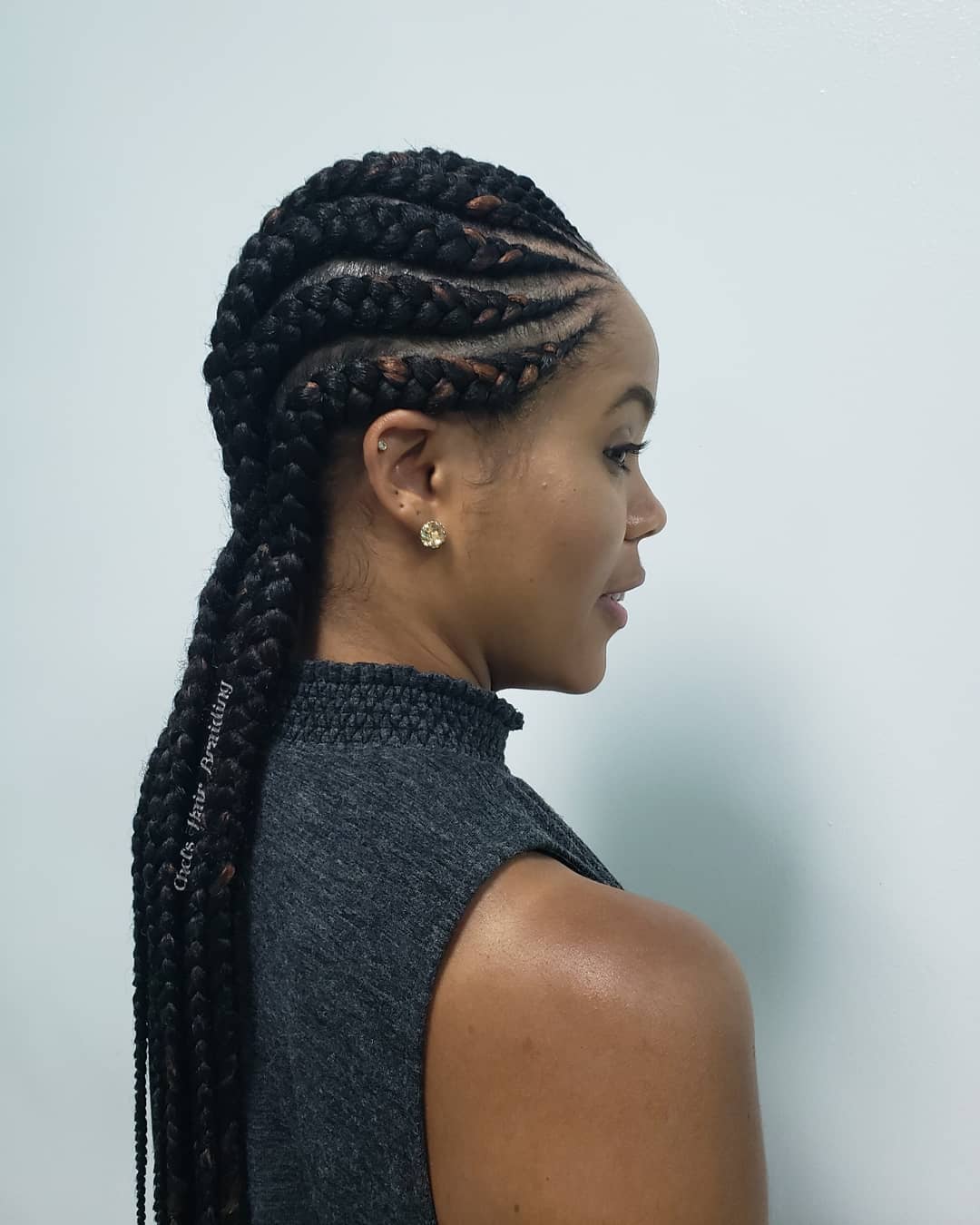Evolved from Ghana braid and feed-in cornrows. It is fire and elegant. Stitch braids are a good protective style. Will aid length retention due to less hair manipulation. Great fit for all ages. The magnificence of the stitch braids is in the final look a neat and unique look. One can opt to add decorations (beads or colorful strain to some braids). Long lasting. You can have a bun, ponytail, half up and half down, etc.