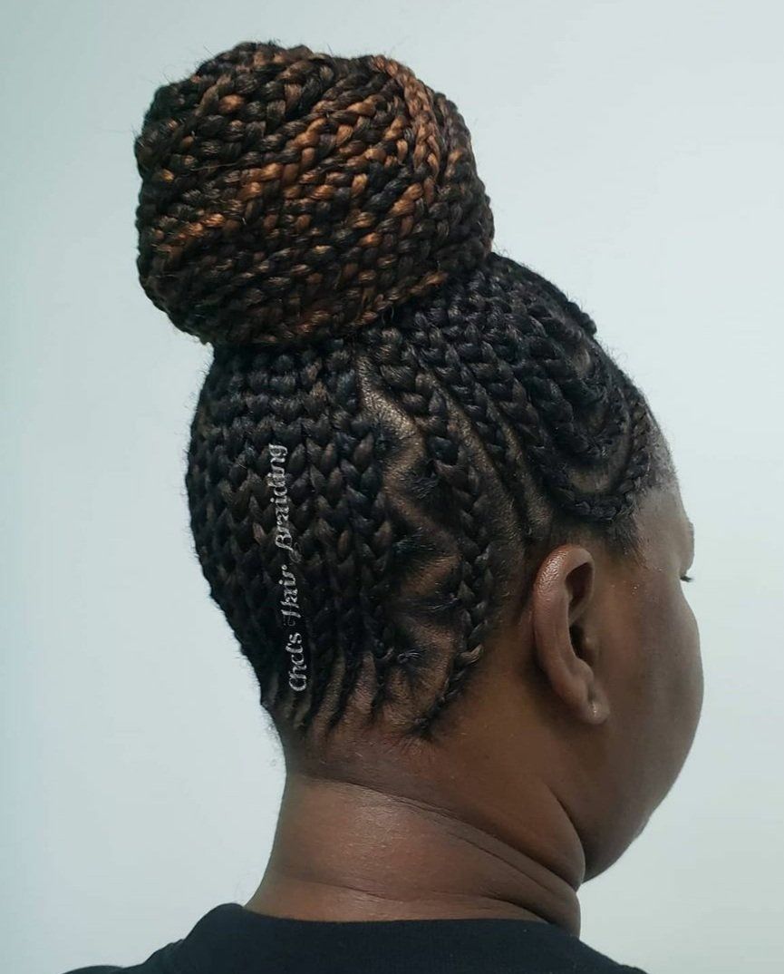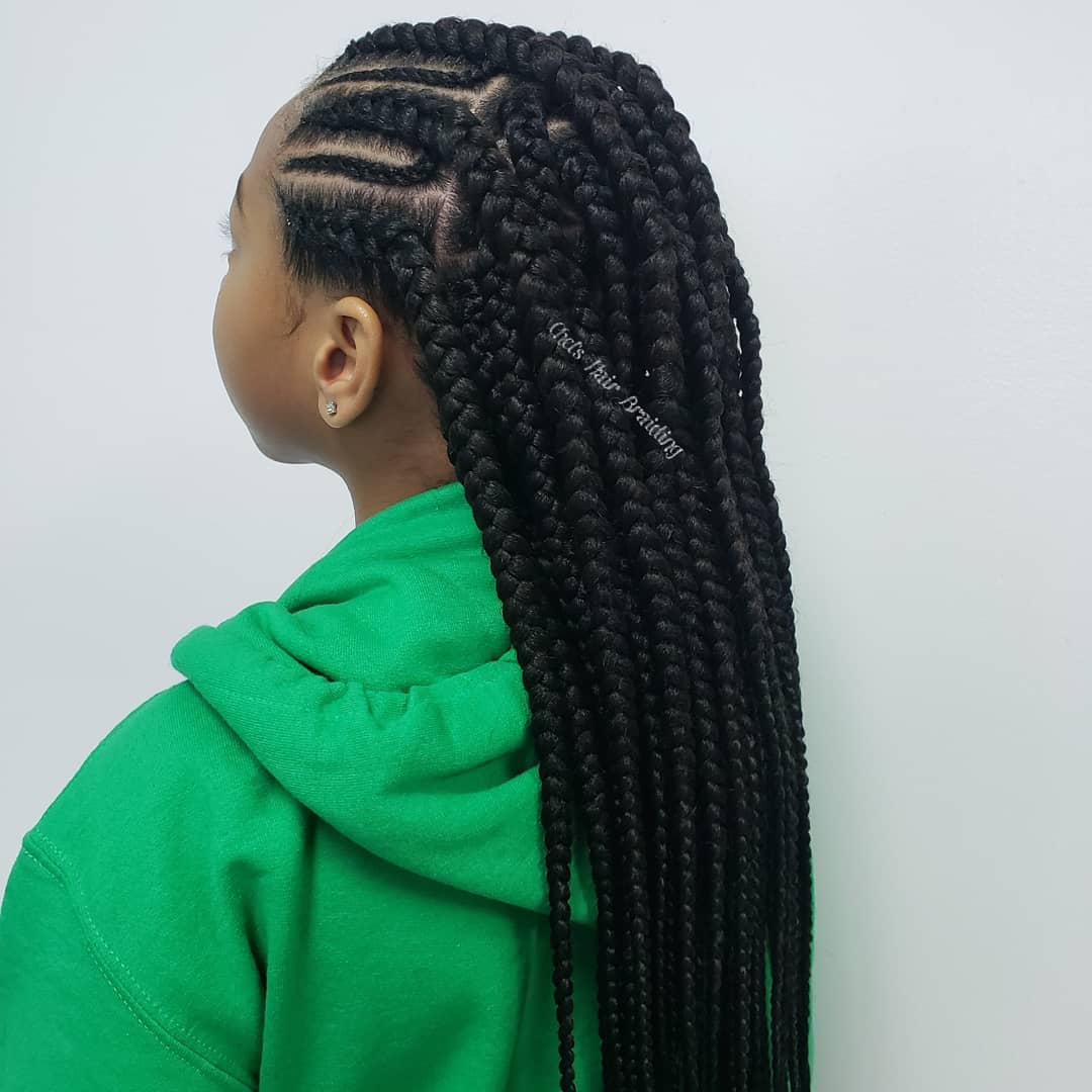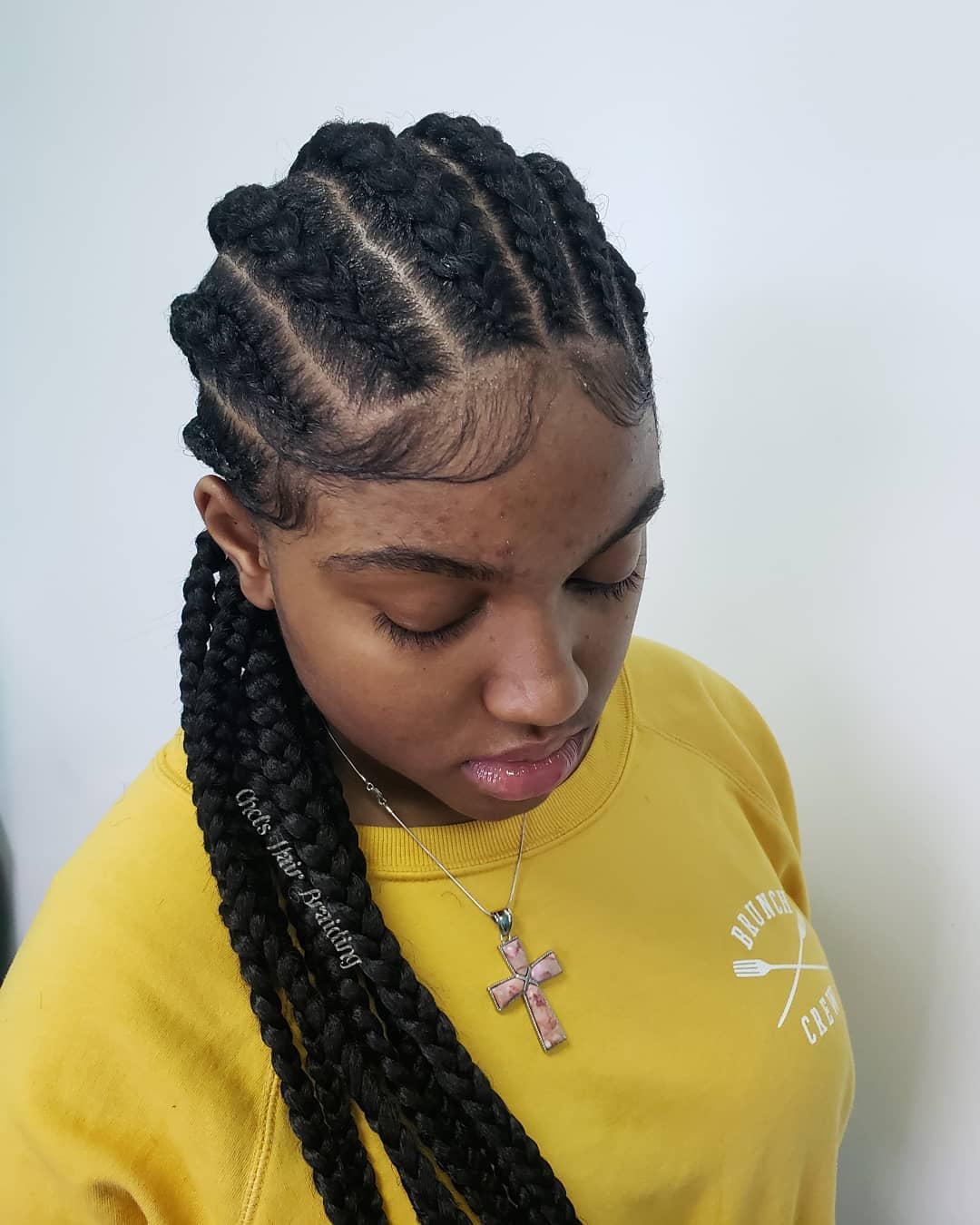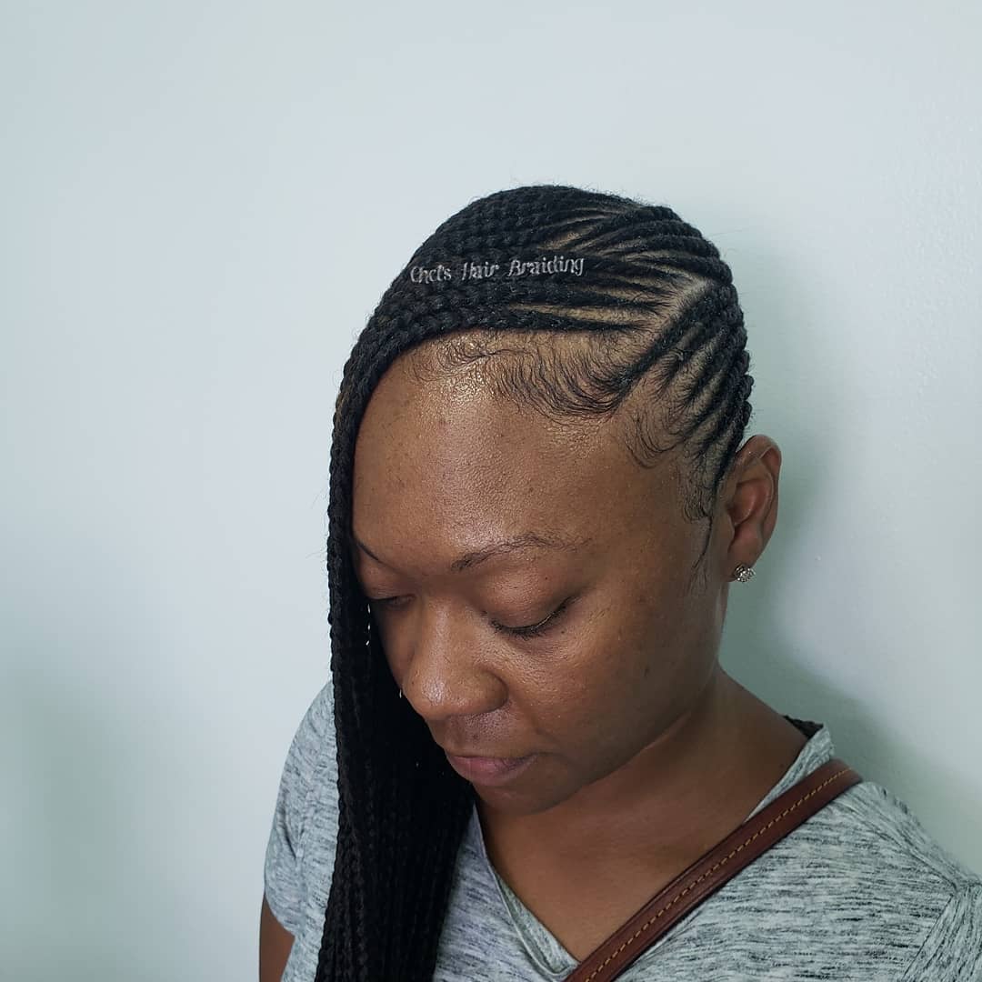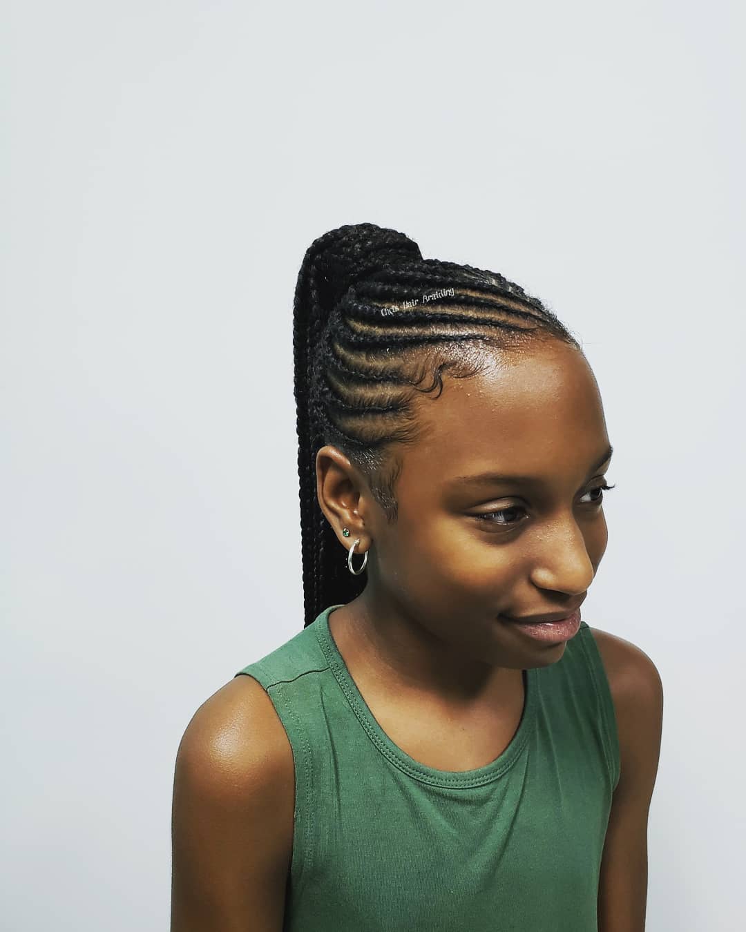 Evolved from Ghana braid and feed-in cornrows. It is fire and elegant. Stitch braids are a good protective style. Will aid length retention due to less hair manipulation. Great fit for all ages. The magnificence of the stitch braids is in the final look a neat and unique look. One can opt to add decorations (beads or colorful strain to some braids). Long lasting. You can have a bun, ponytail, half up and half down, etc.