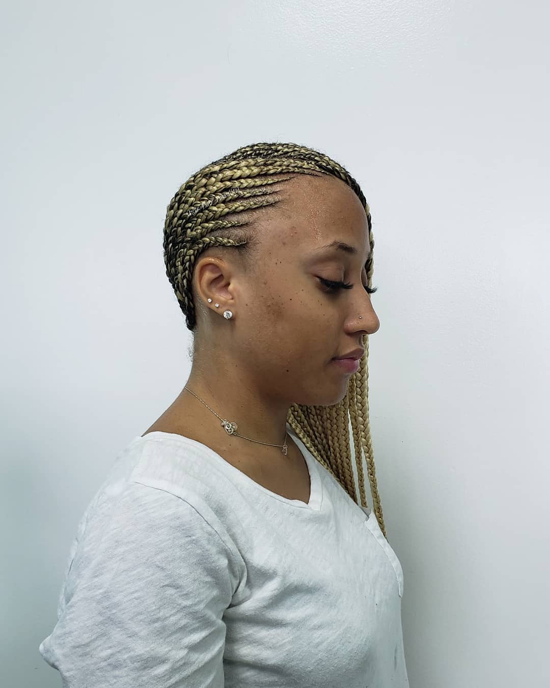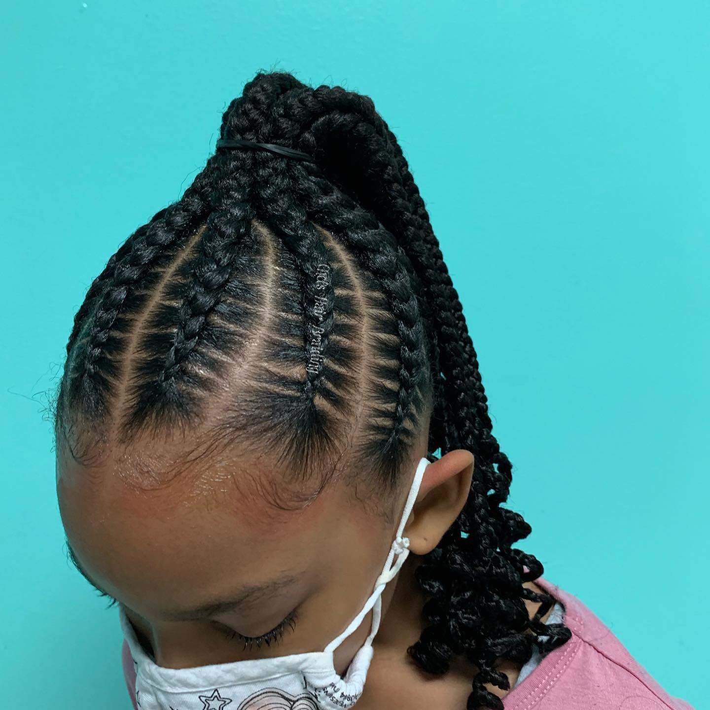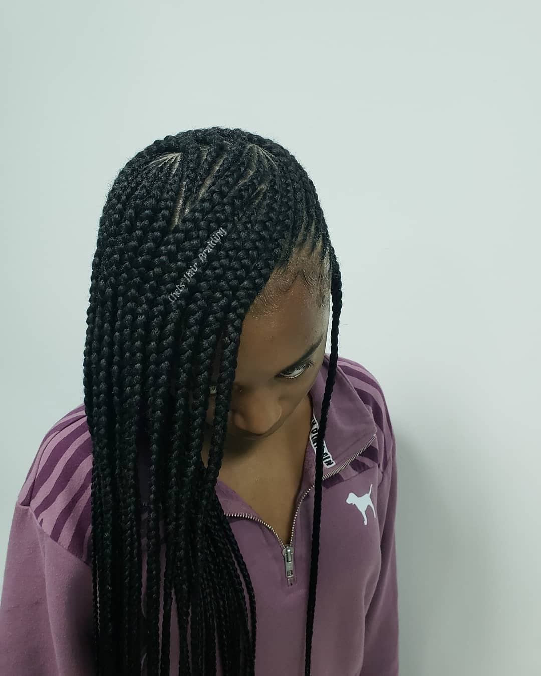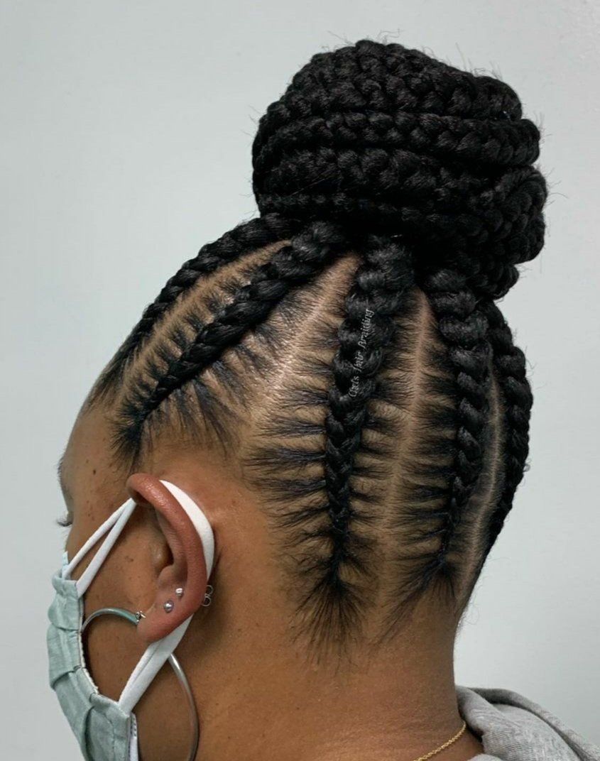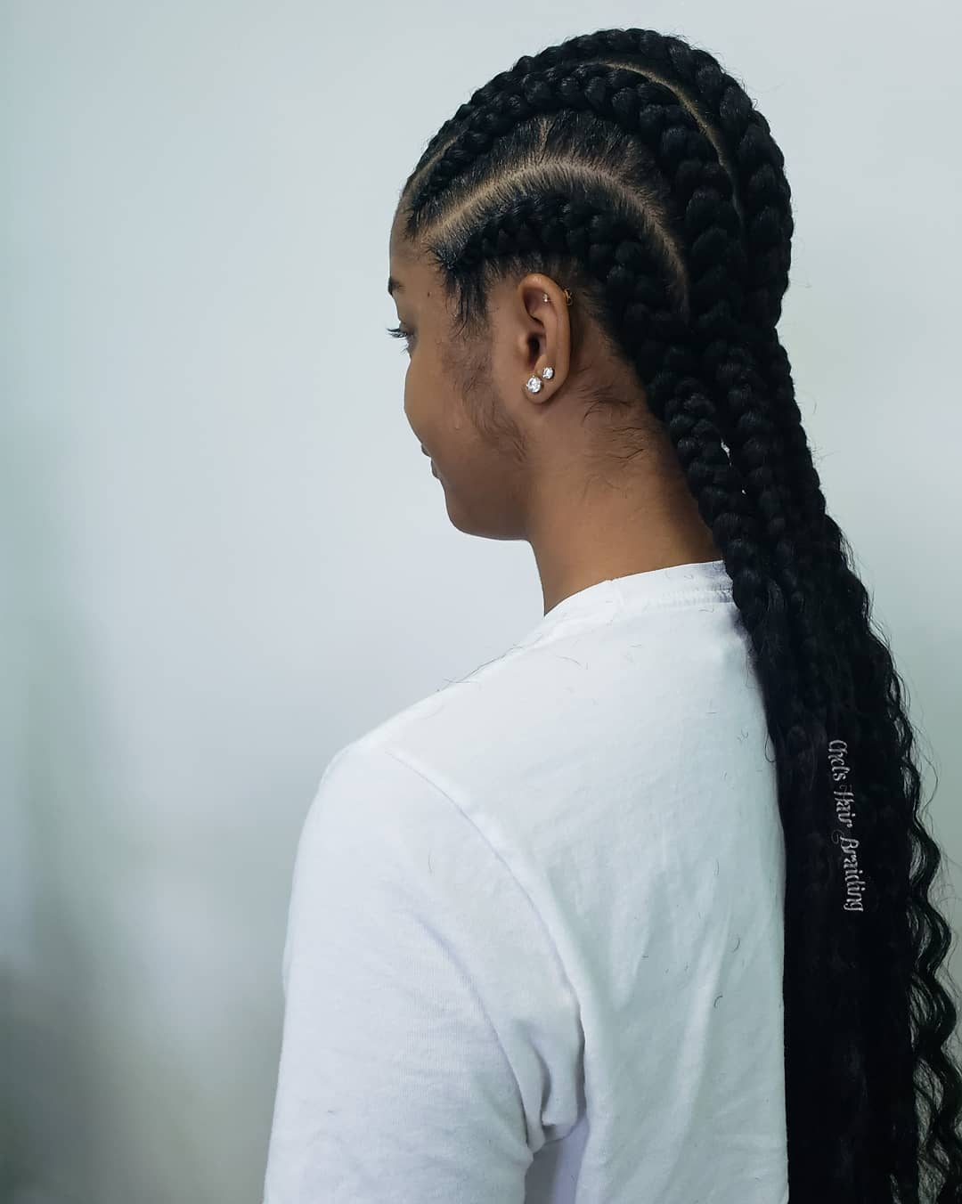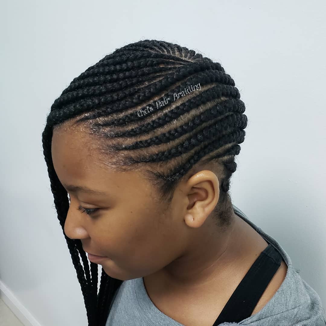 Evolved from Ghana braid and feed-in cornrows. It is fire and elegant. Stitch braids are a good protective style. Will aid length retention due to less hair manipulation. Great fit for all ages. The magnificence of the stitch braids is in the final look a neat and unique look. One can opt to add decorations (beads or colorful strain to some braids). Long lasting. You can have a bun, ponytail, half up and half down, etc.