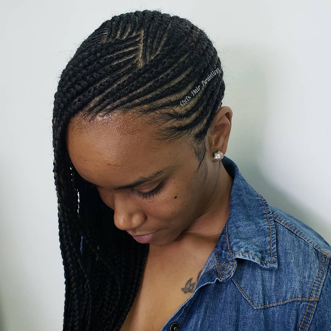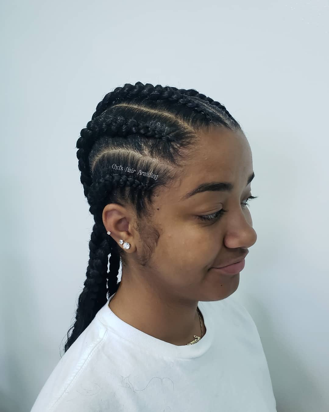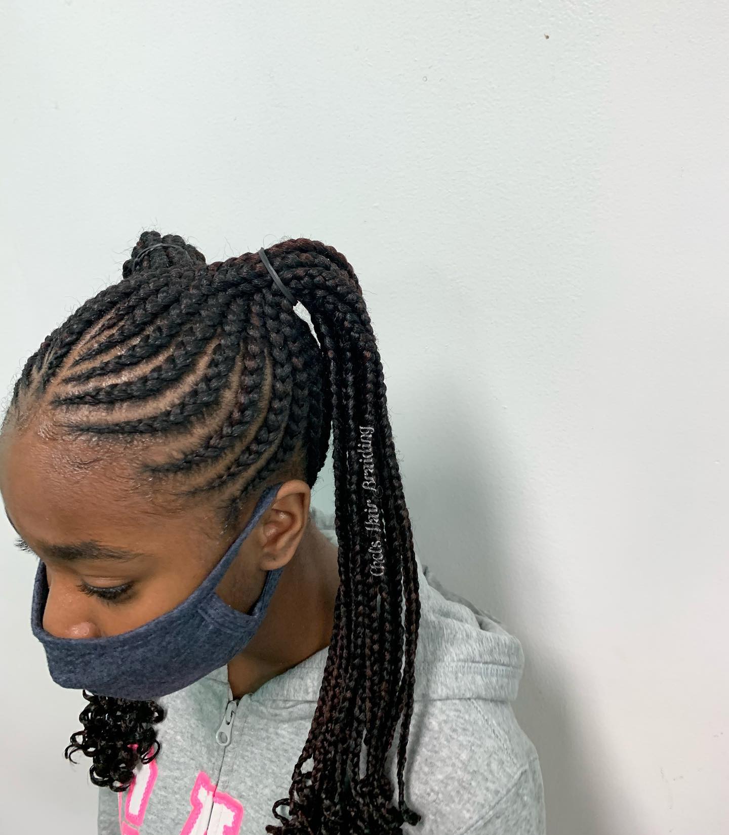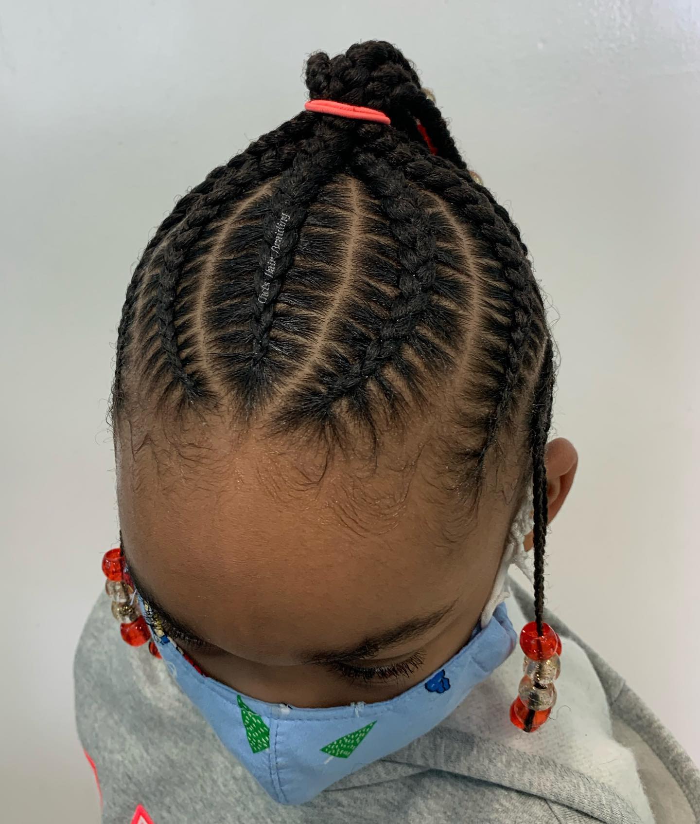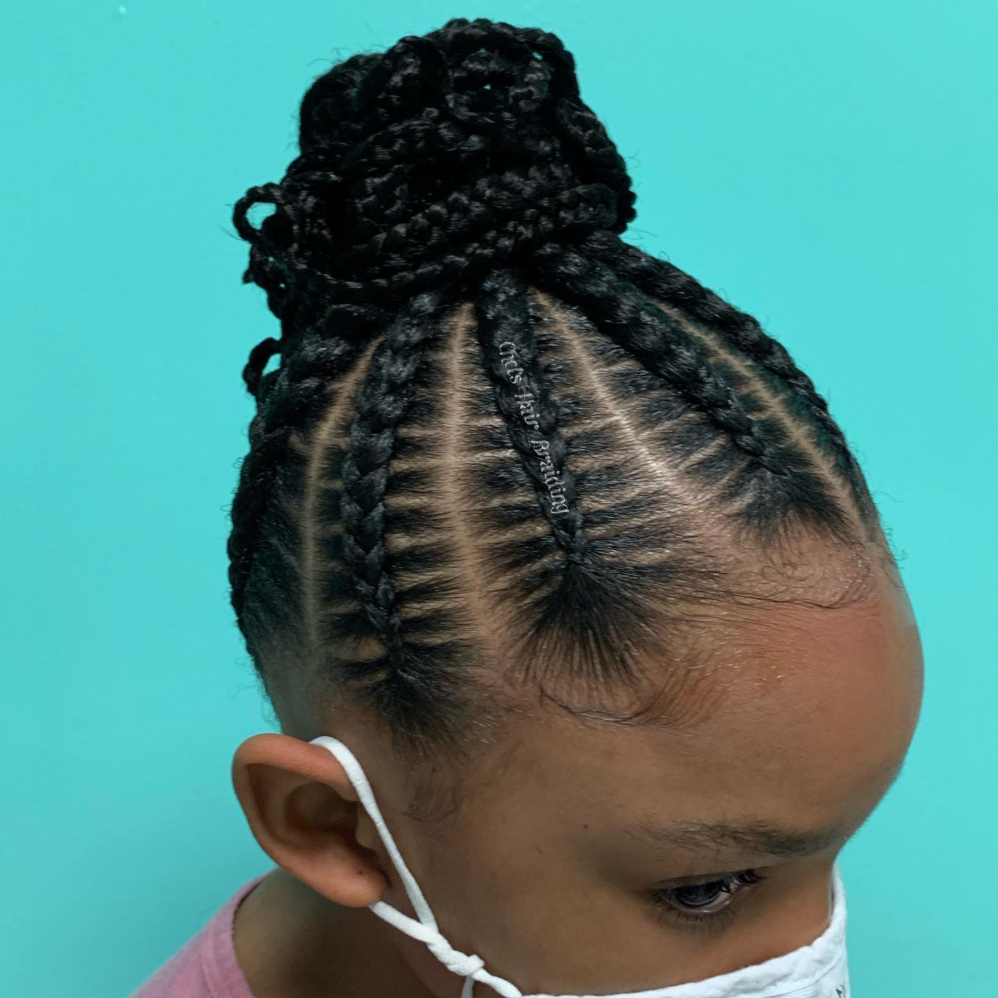 Evolved from Ghana braid and feed-in cornrows. It is fire and elegant. Stitch braids are a good protective style. Will aid length retention due to less hair manipulation. Great fit for all ages. The magnificence of the stitch braids is in the final look a neat and unique look. One can opt to add decorations (beads or colorful strain to some braids). Long lasting. You can have a bun, ponytail, half up and half down, etc.