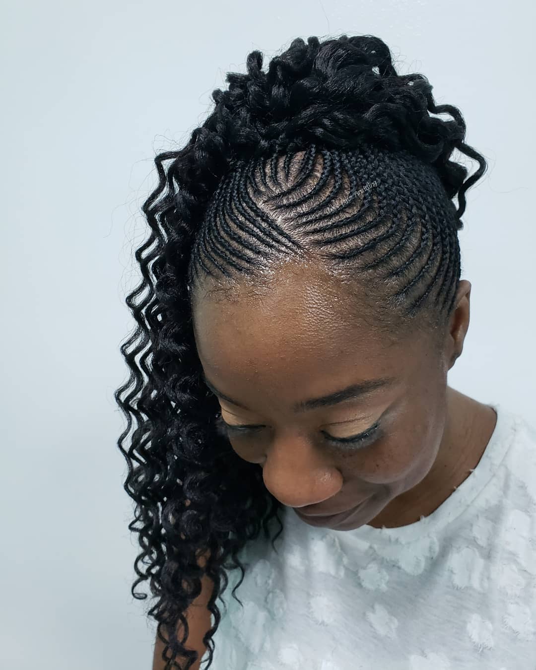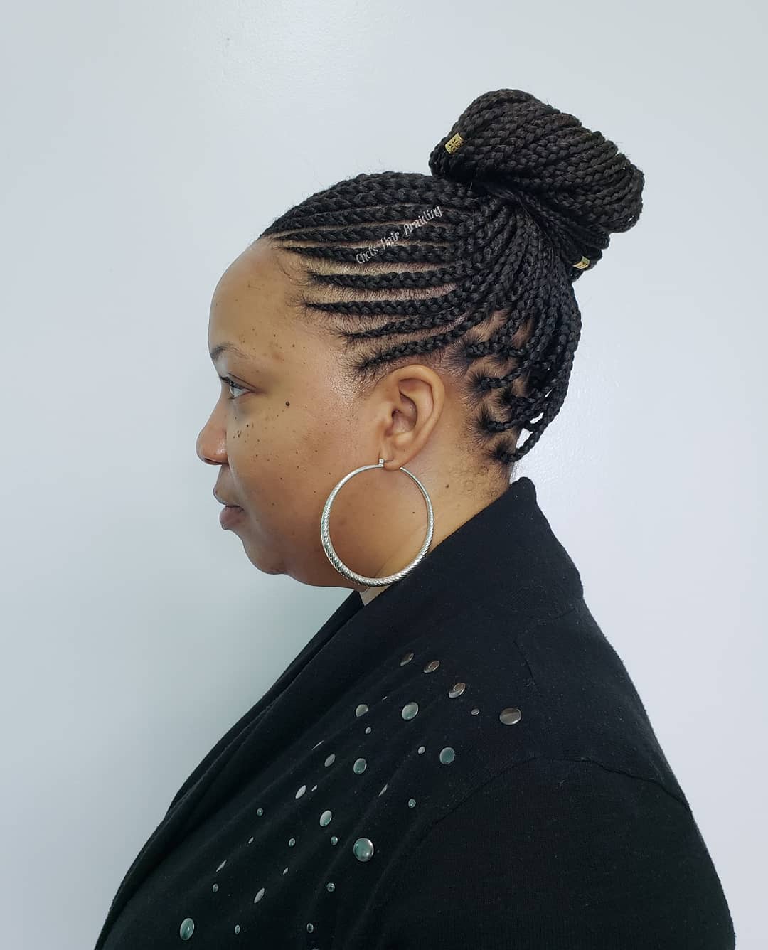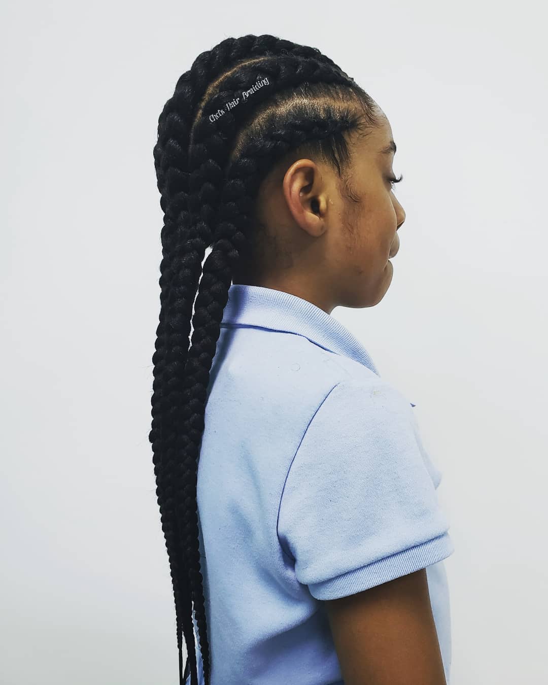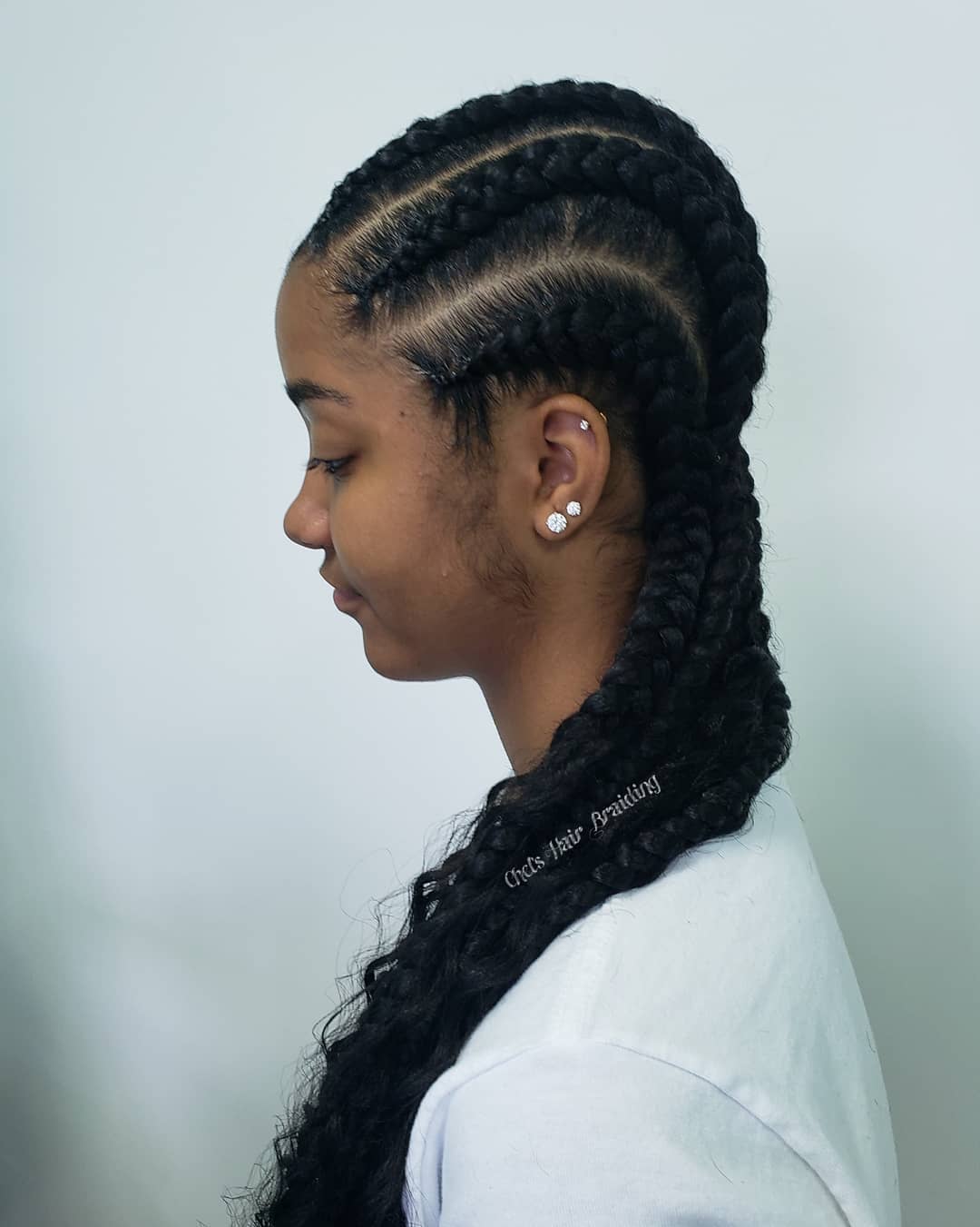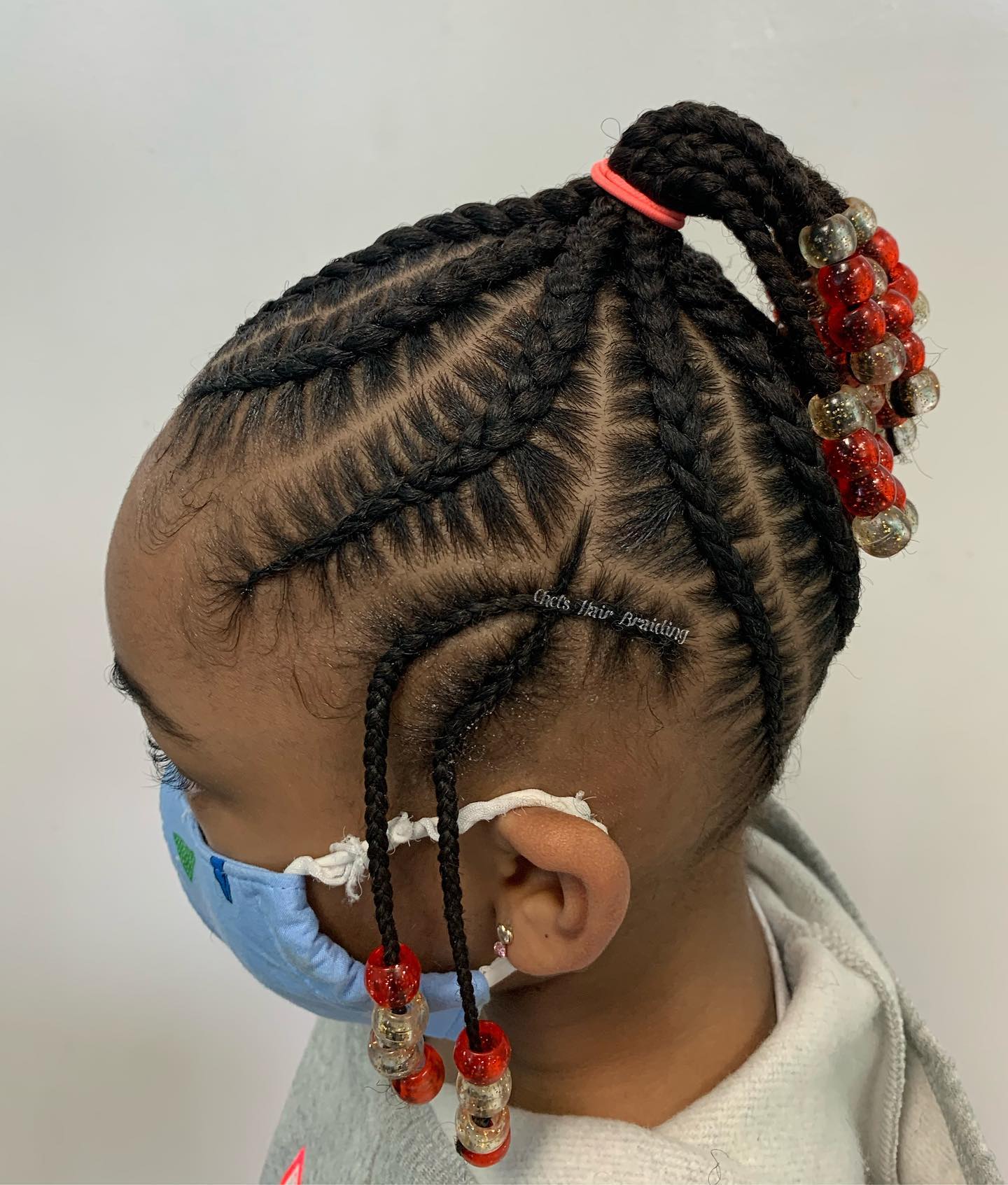 Evolved from Ghana braid and feed-in cornrows. It is fire and elegant. Stitch braids are a good protective style. Will aid length retention due to less hair manipulation. Great fit for all ages. The magnificence of the stitch braids is in the final look a neat and unique look. One can opt to add decorations (beads or colorful strain to some braids). Long lasting. You can have a bun, ponytail, half up and half down, etc.