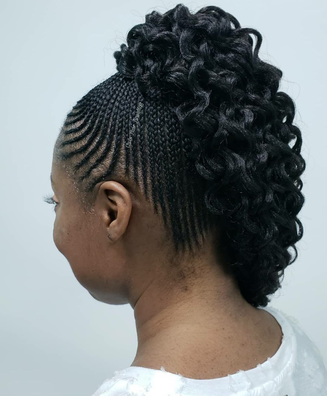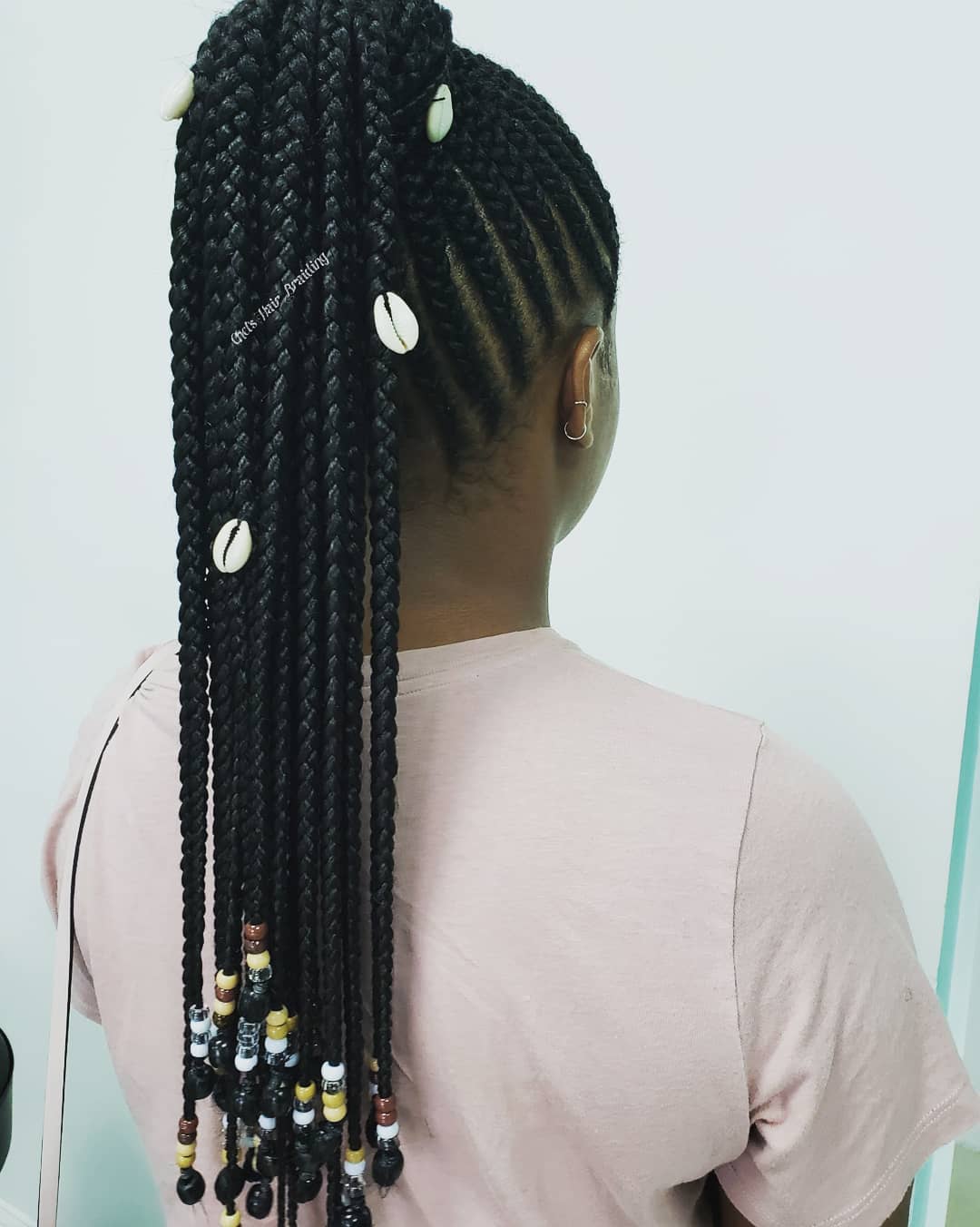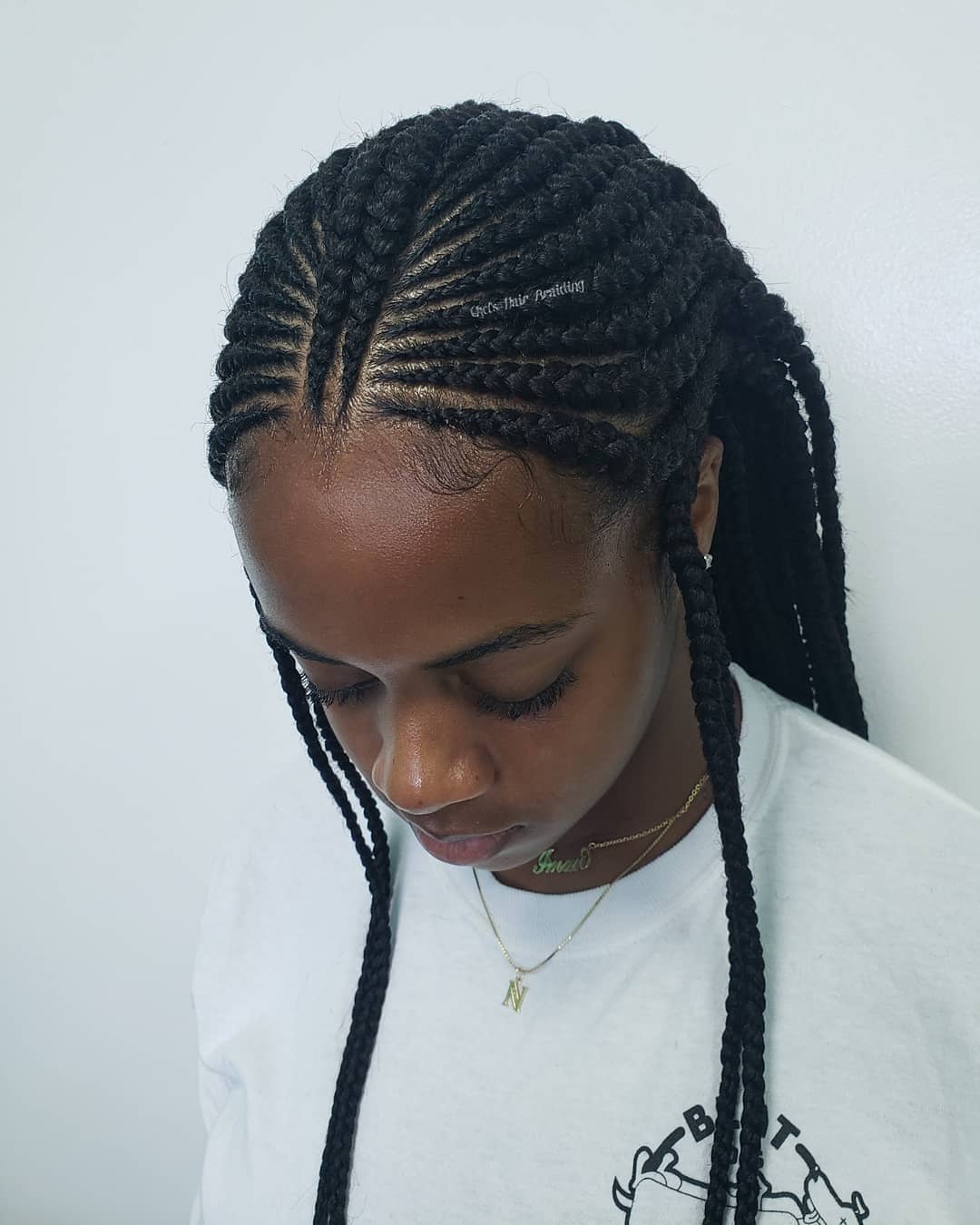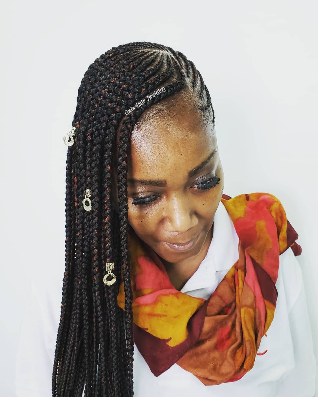 Protective hairstyle inspired by the Fulani people of Africa. It is a protective style, very elegant for queens. It is cornrow-braided in front and box braided or Senegalese or knotless in the back of the head. Very lightweight, helping retain length. Can be well-accessorized with beads and cori. One of the most popular styles worn by celebrities, magazines, and red carpet. Patterns of thin to medium. Whether you want to rock waist-long braids or go for a braided bob, there is a Fulani hairstyle for you to love.
