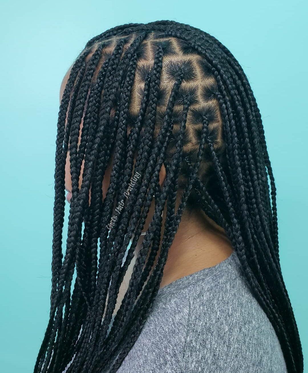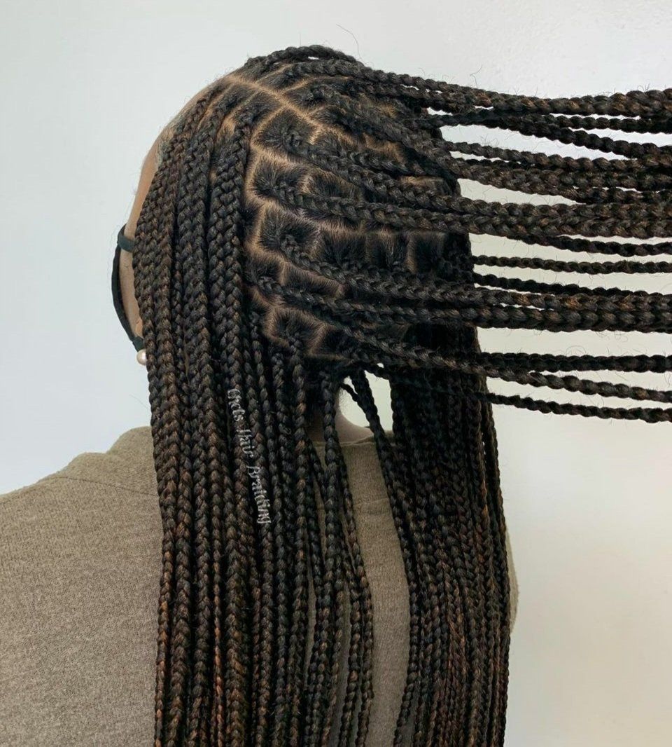 Knotless braids is a modern iteration of classic Box Braids but less tension on roots. Knotless is a trend these days. Definitely good option because there is less tension on the hair scalp. Very flexible, keep hair healthier, can be style right away after getting them done. Knotless definitely make hair grow very lightweight. So convenient it can be done in square, rectangle, triangle and semicircle. Knotless comes in different length and size.