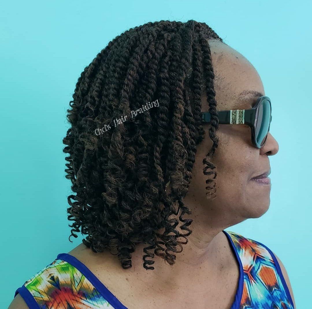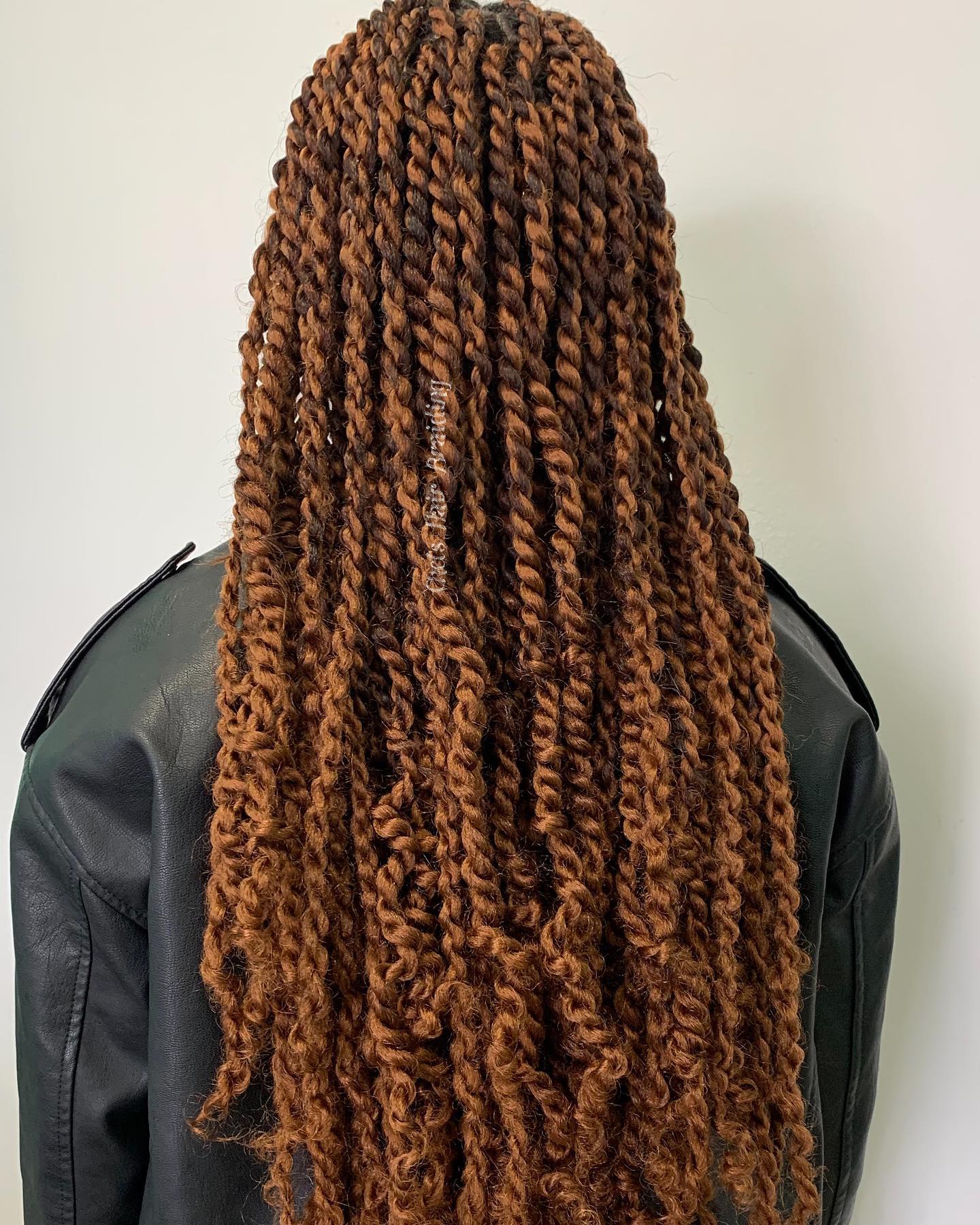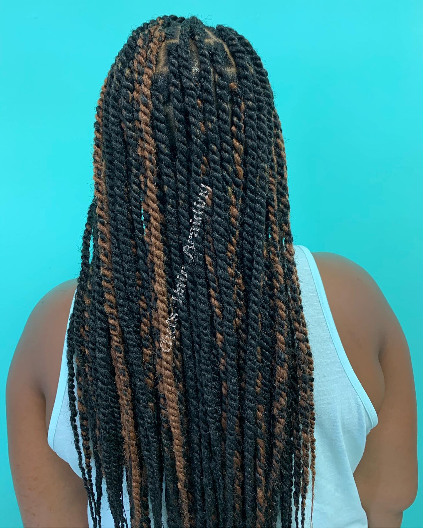 Chunky protective style. Achieve by twisting Marley hair with your own hair. Closer to natural hair texture. Super easy to take care of. Similar appearance to locs, but much easier to install. Can be done in different length and color. Let’s rock this Jamaican look!