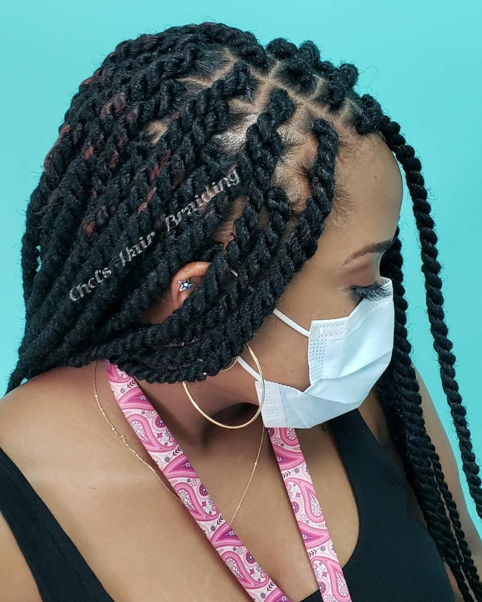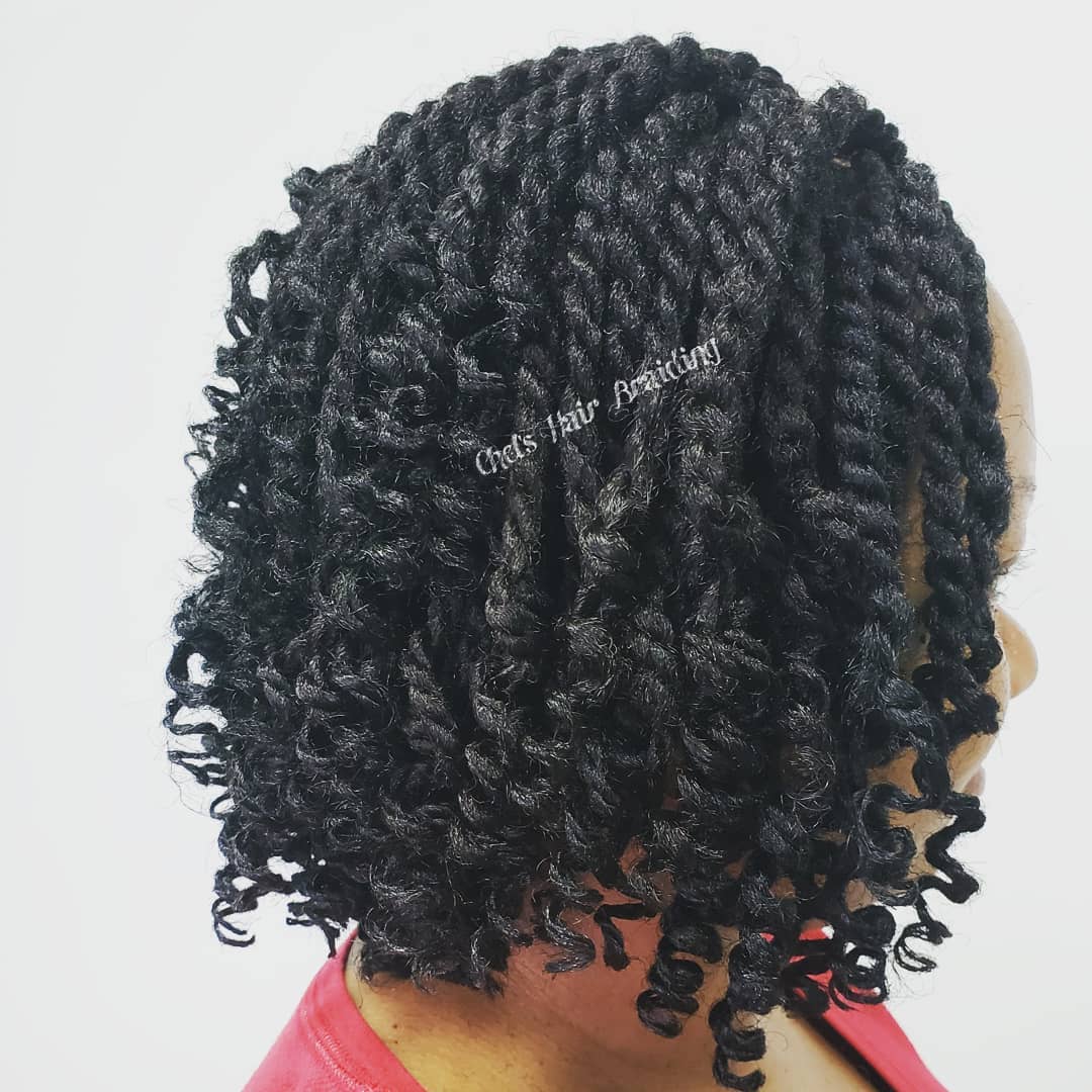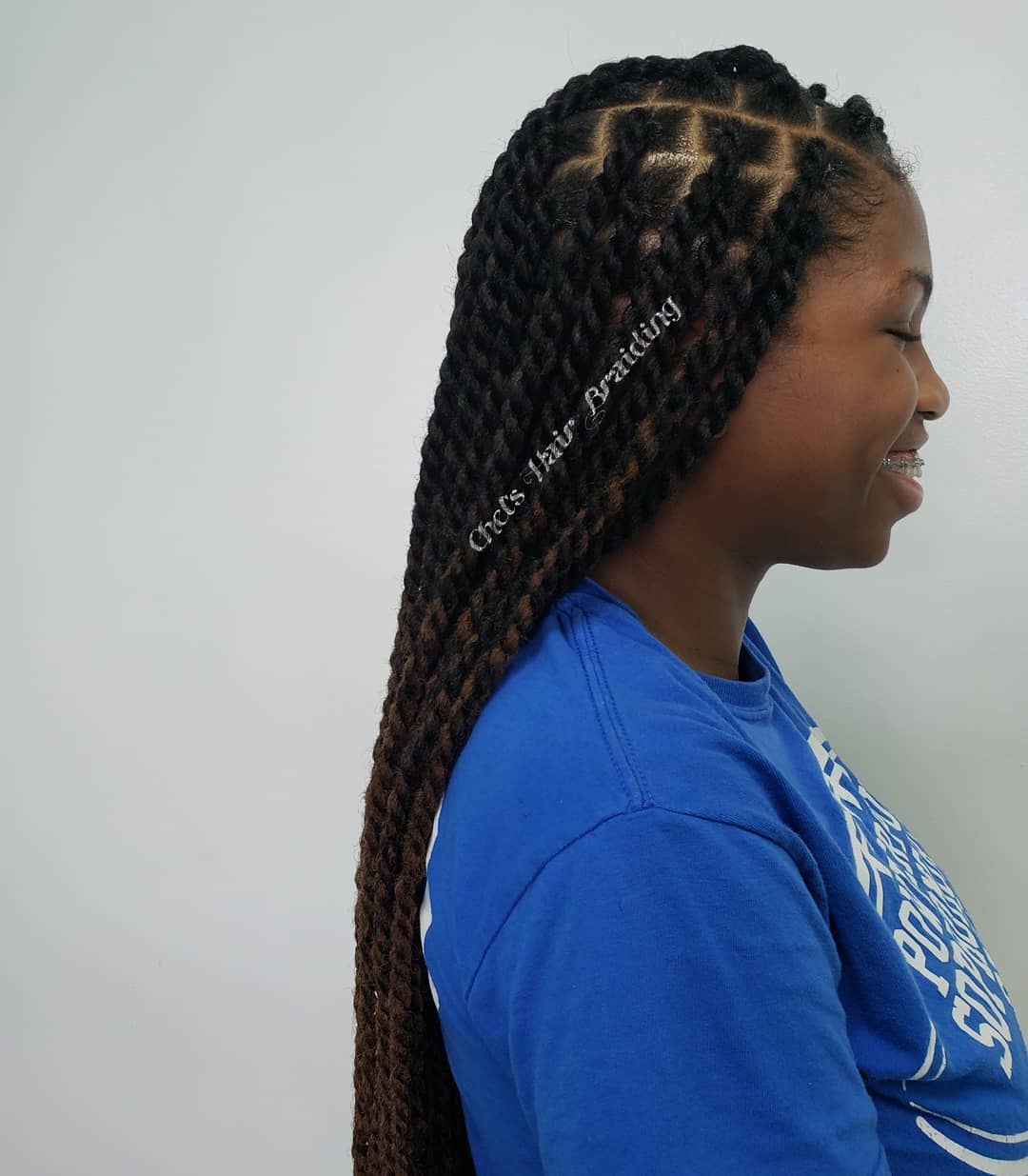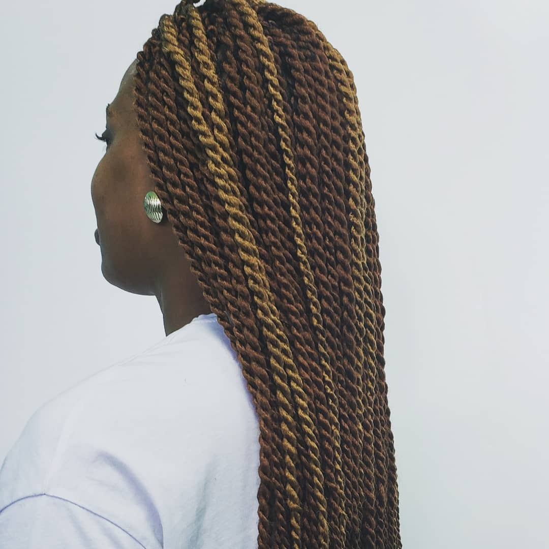 Chunky protective style. Achieve by twisting Marley hair with your own hair. Closer to natural hair texture. Super easy to take care of. Similar appearance to locs, but much easier to install. Can be done in different length and color. Let’s rock this Jamaican look!